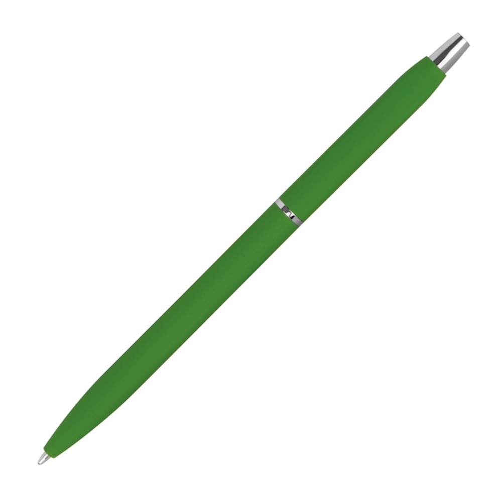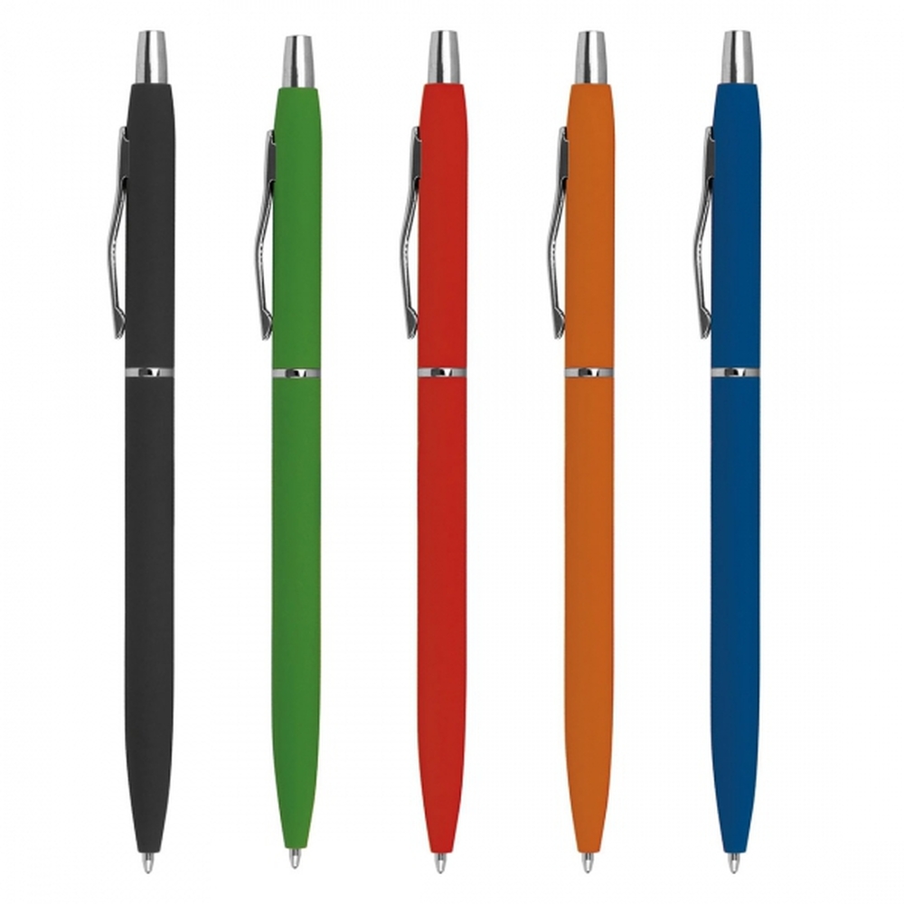 Slim, rubberized metal ball pen in different colors, with silver applications and blue-writing refill. We will engrave your logo to the right of the clip.