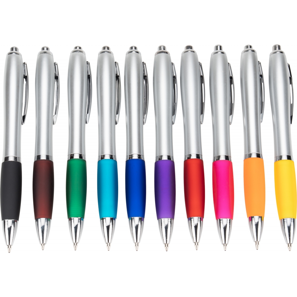 Classic plastic pen is a top seller among promotional gadgets. Equipped with a non-slip rubber grip area, it ensures a secure hold and comfort while writing. Shiny finishing elements give it a modern look, and the click mechanism allows for easy and quick ink refill extension.