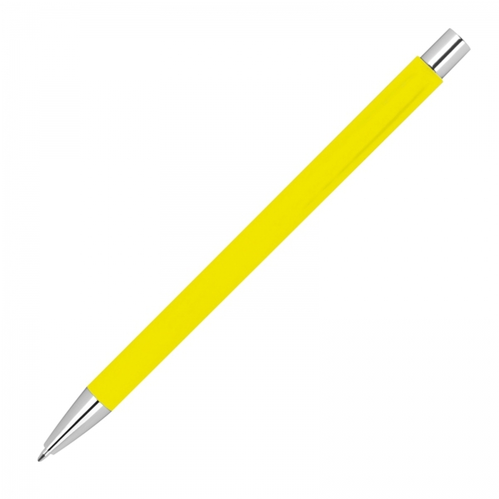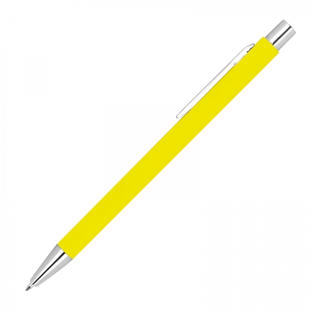 Slim metal retractable ball pen with silver applications, soft touch surface and blue-writing refill.