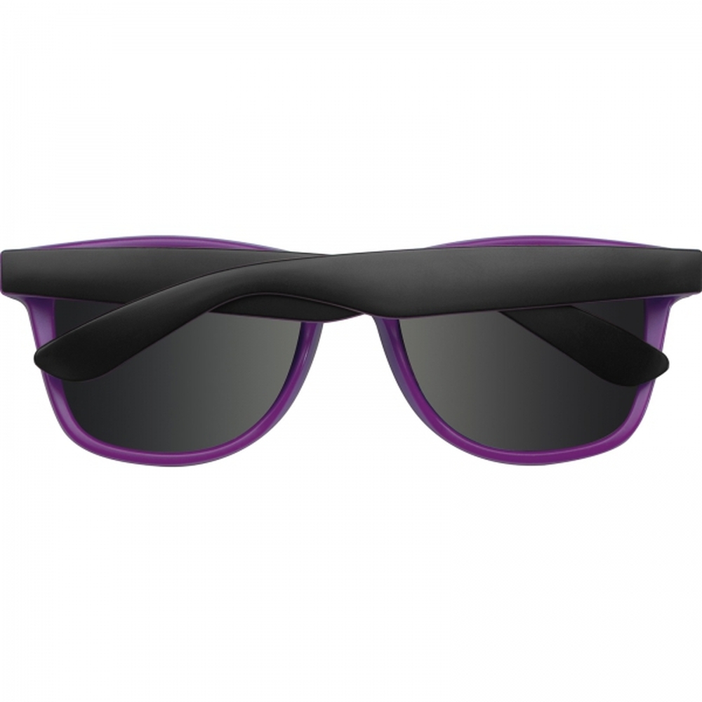 Stylish sunglasses made of plastic, with two coloured frame and mirrored lenses with UV 400, category 3 protection. We will print your logo on the black frame.