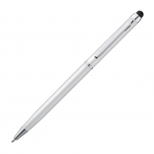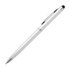 Rotary ball pen made of plastic in elegant slim shape, providing a blue-writing refill and a practical touch pad for effortless handling of current smartphones and tablet PCs.