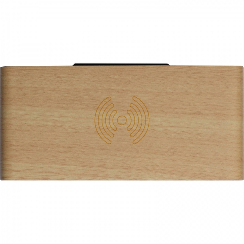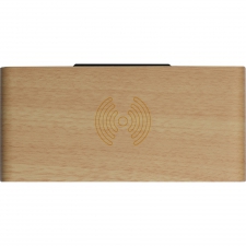 Bamboo desk clock with smartphone holder, wireless charger, and storage compartment. USB charging cable included. Your logo will be printed.
