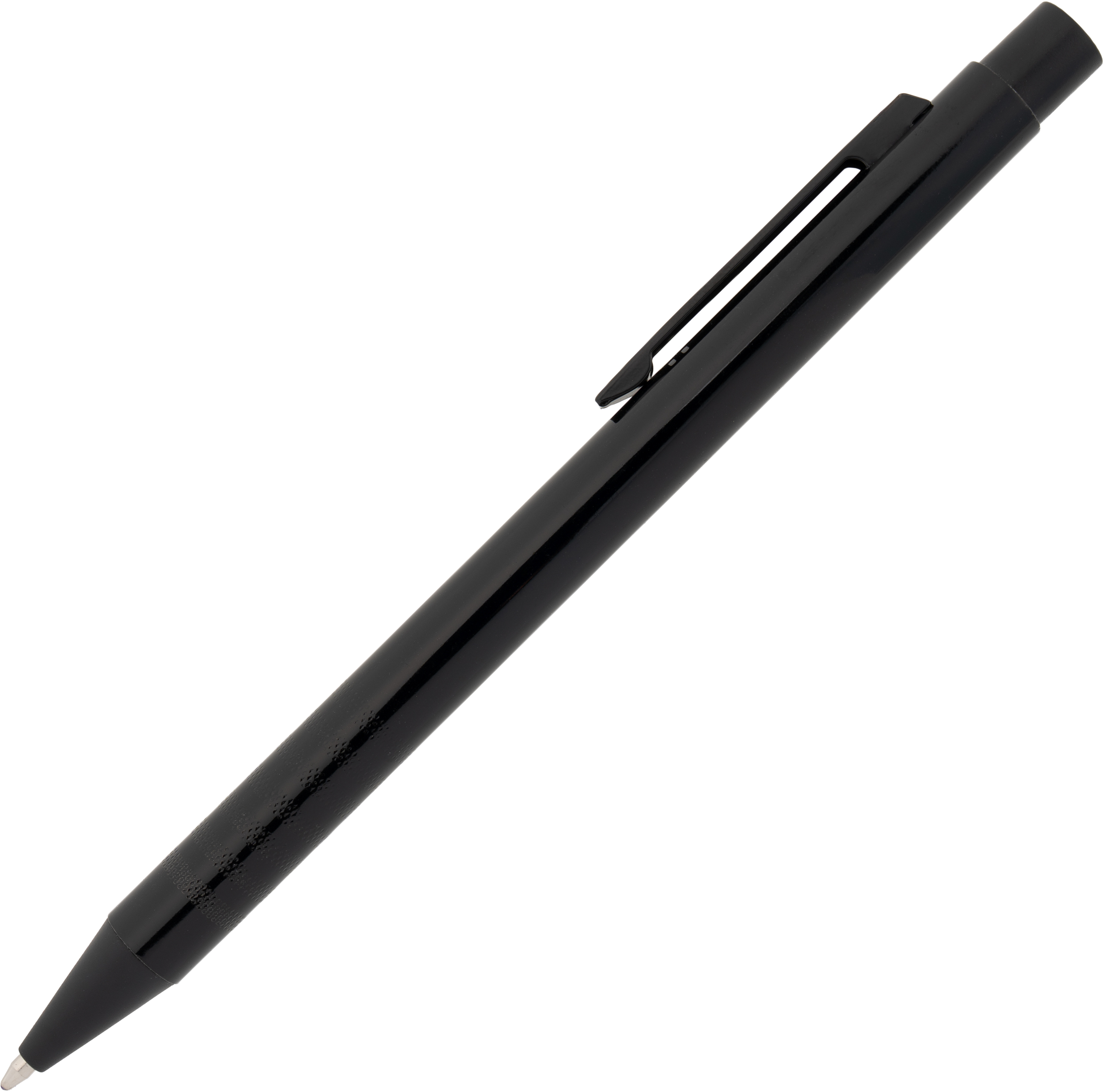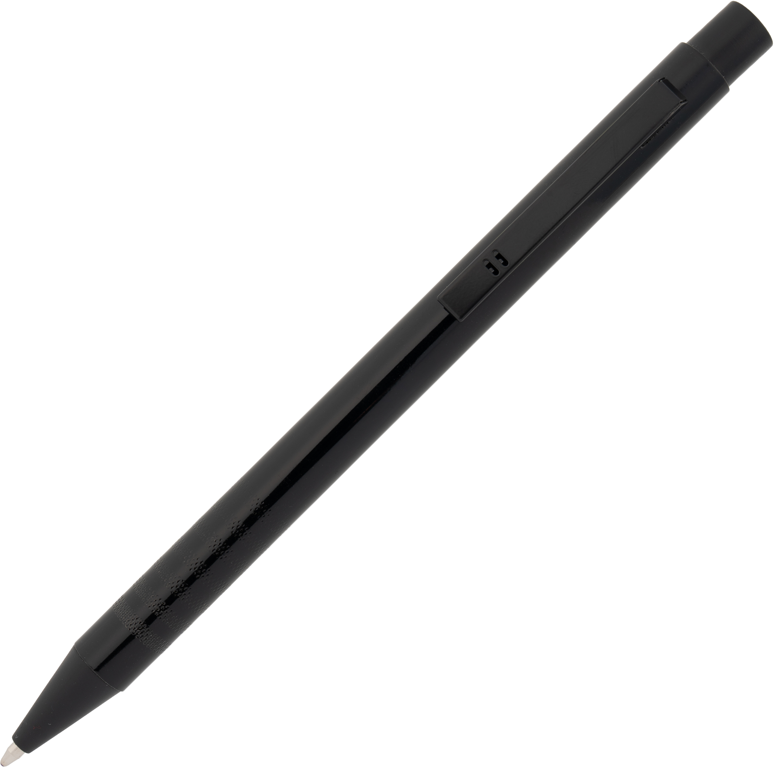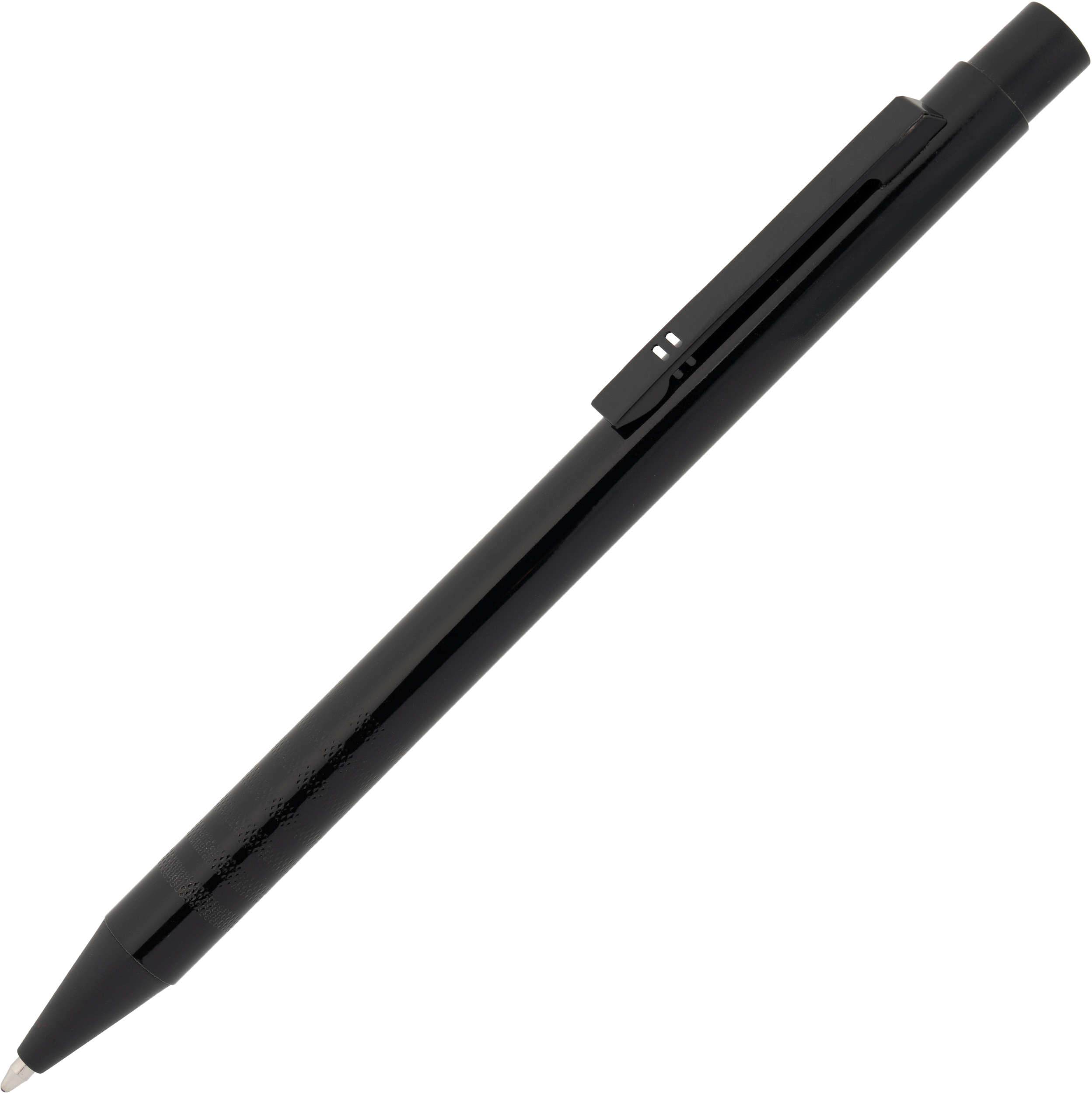 Metal ballpoint pen with blue writing refill and fancy grip zone. Your advertisement will be laser engraved to the right of the clip.