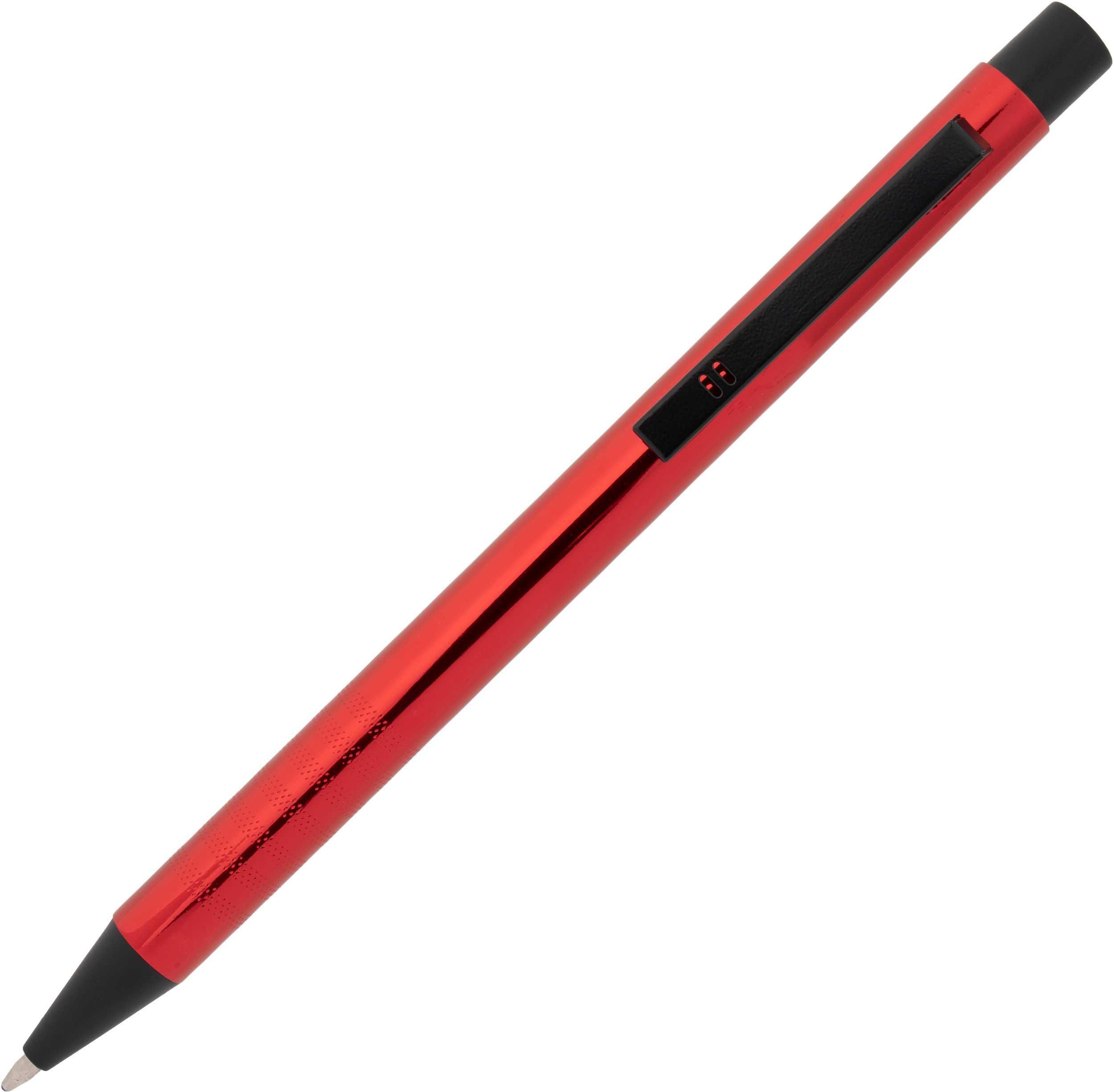 Metal ballpoint pen with blue writing refill and fancy grip zone. Your advertisement will be laser engraved to the right of the clip.