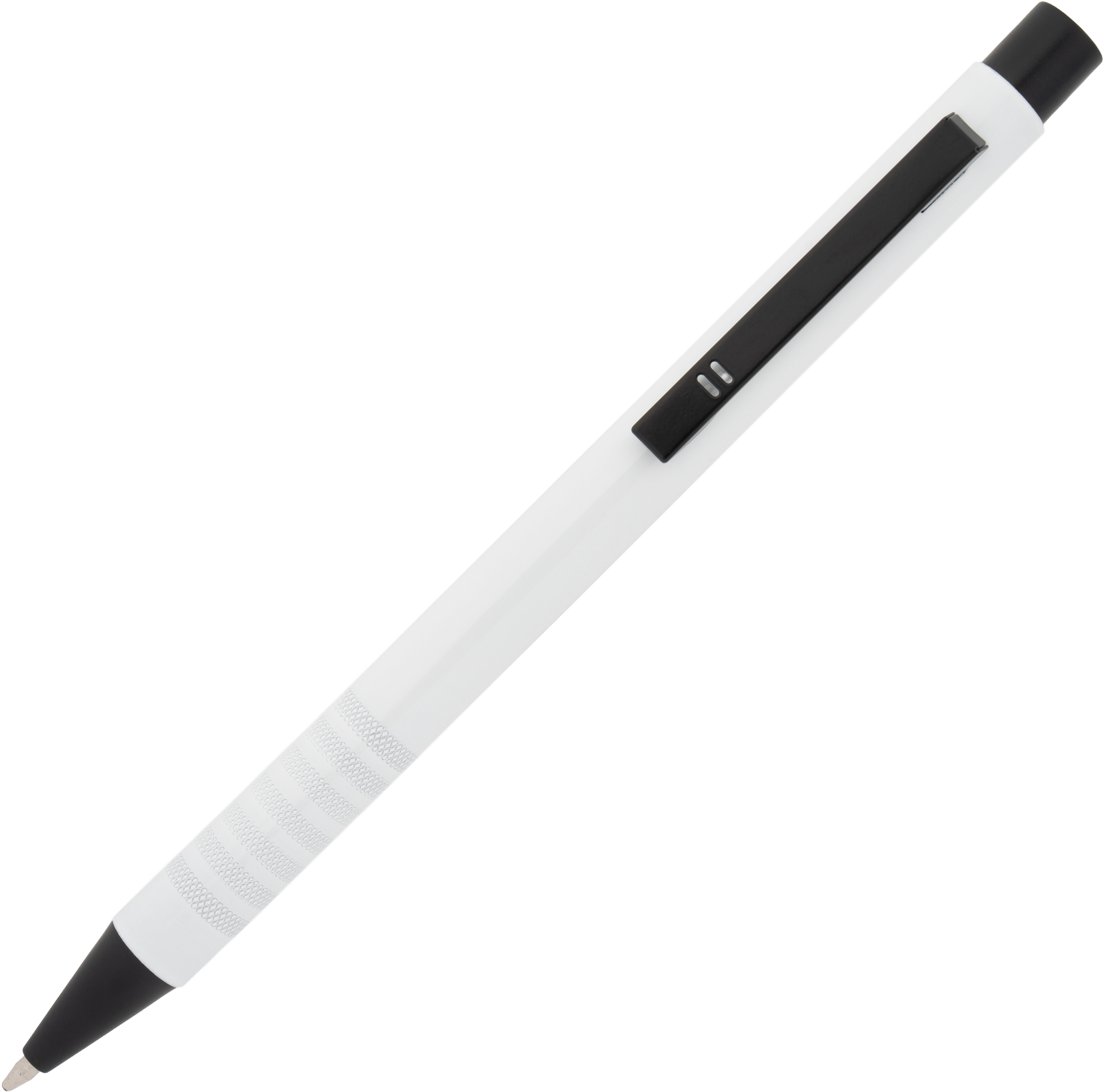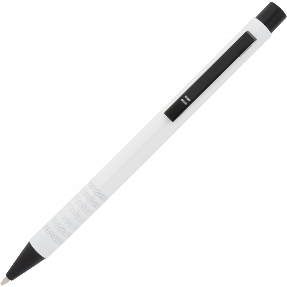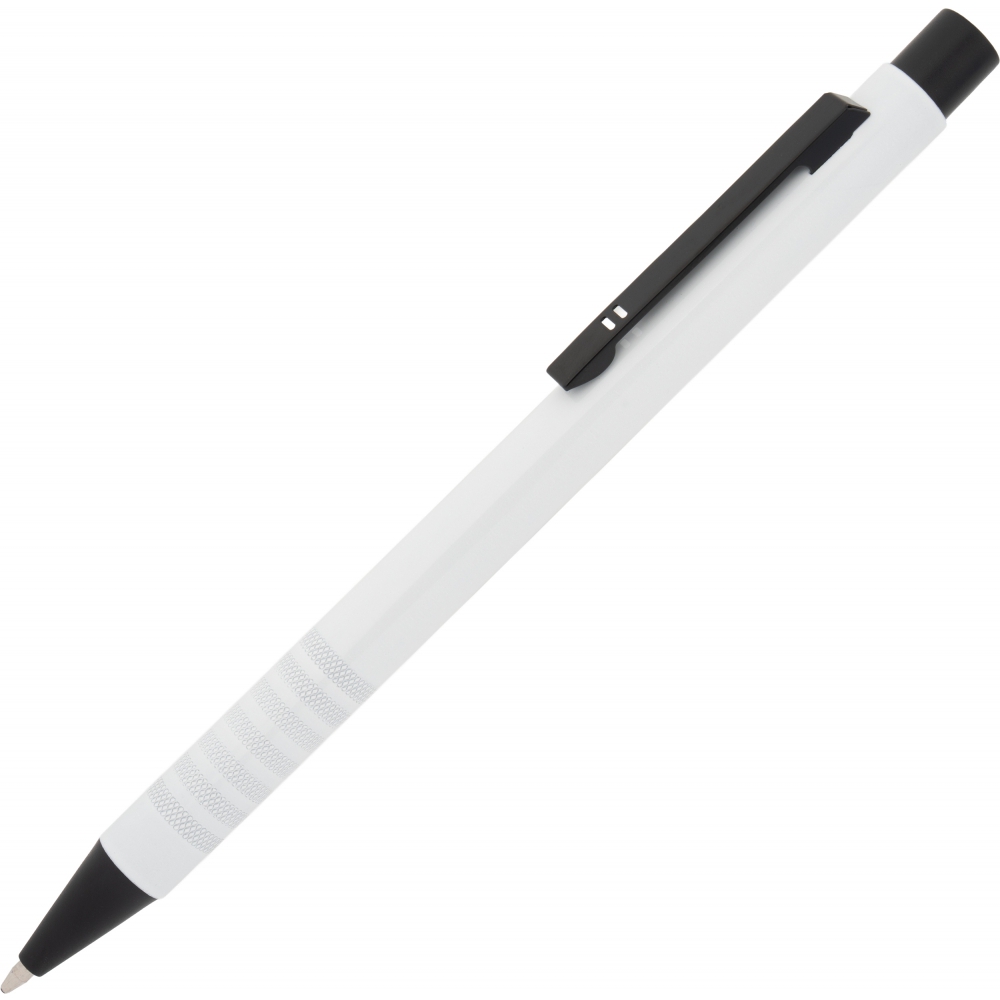 Metal ballpoint pen with blue writing refill and fancy grip zone. Your advertisement will be laser engraved to the right of the clip.
