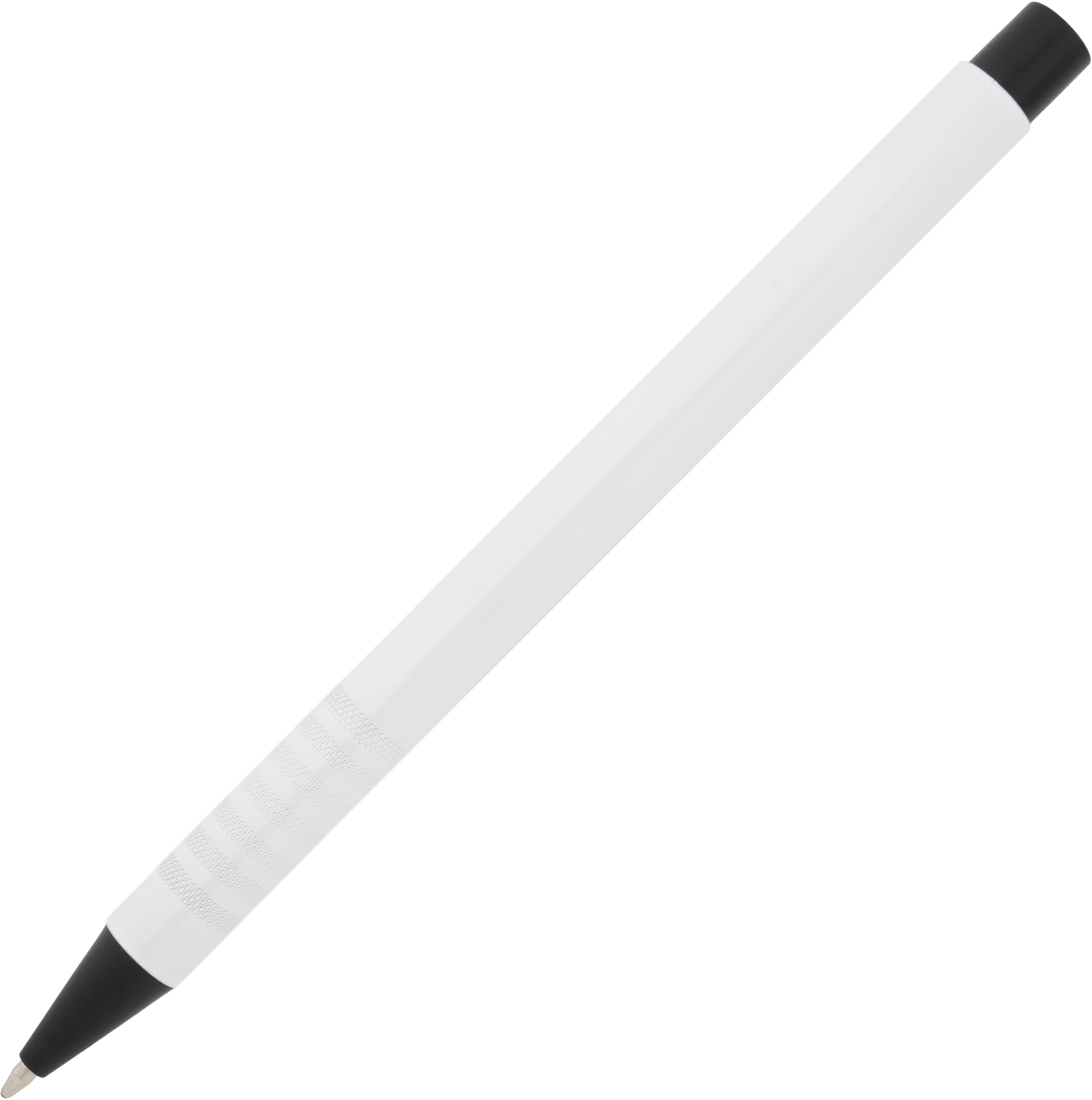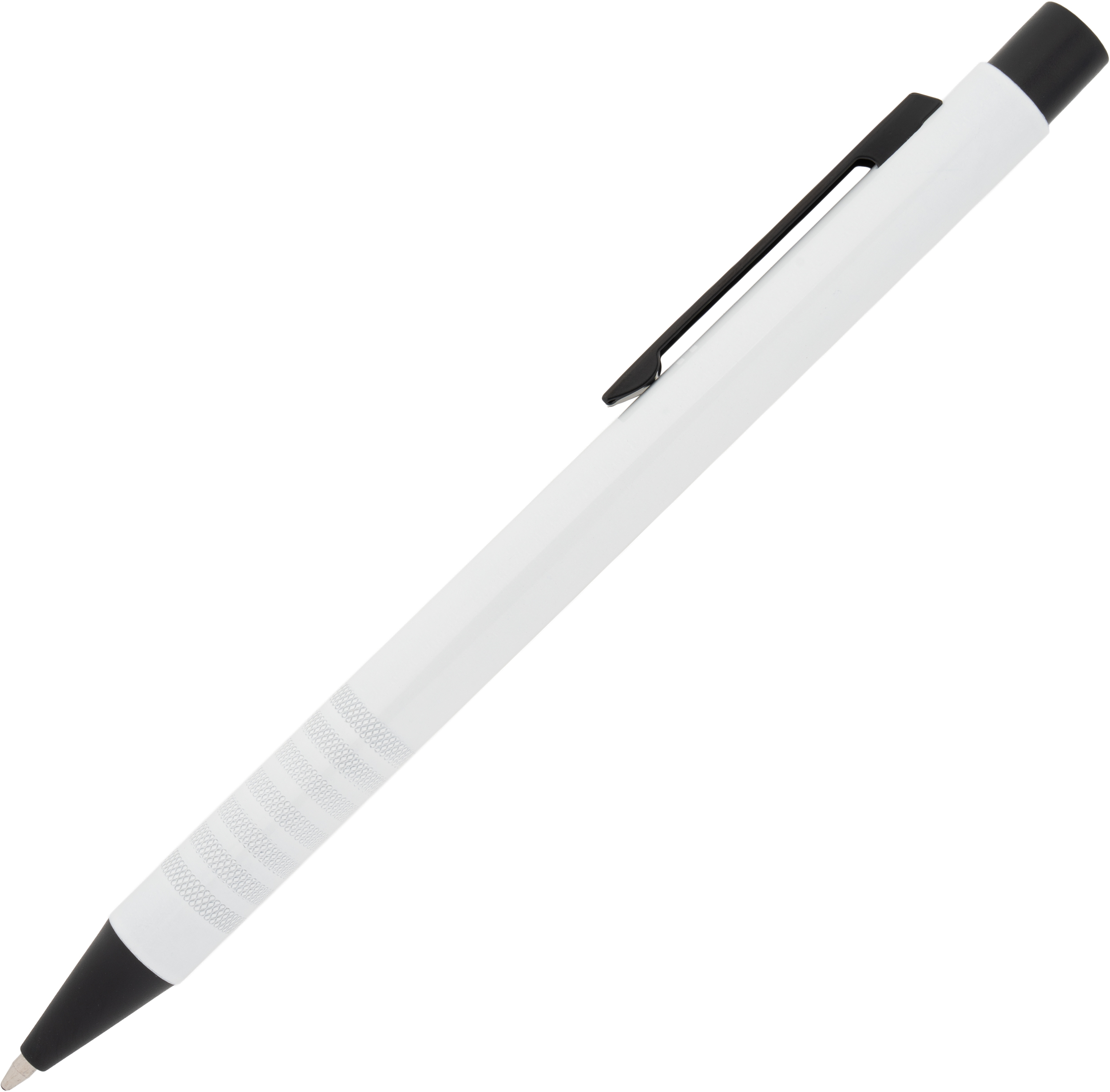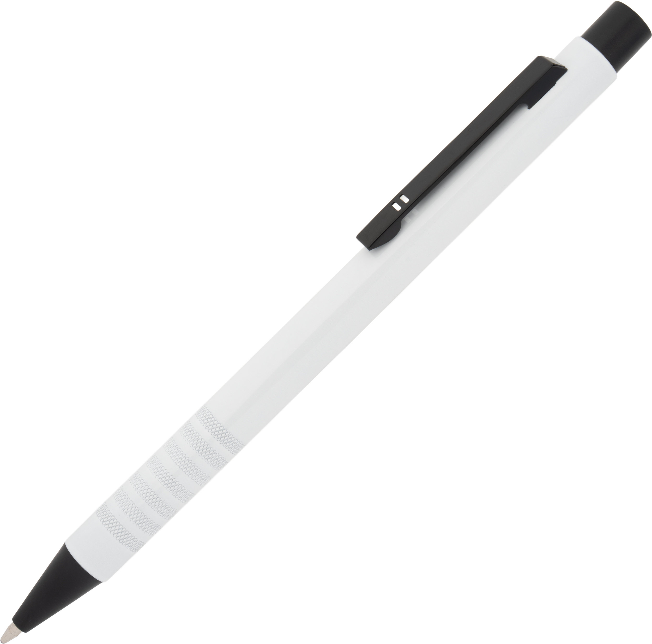 Metal ballpoint pen with blue writing refill and fancy grip zone. Your advertisement will be laser engraved to the right of the clip.