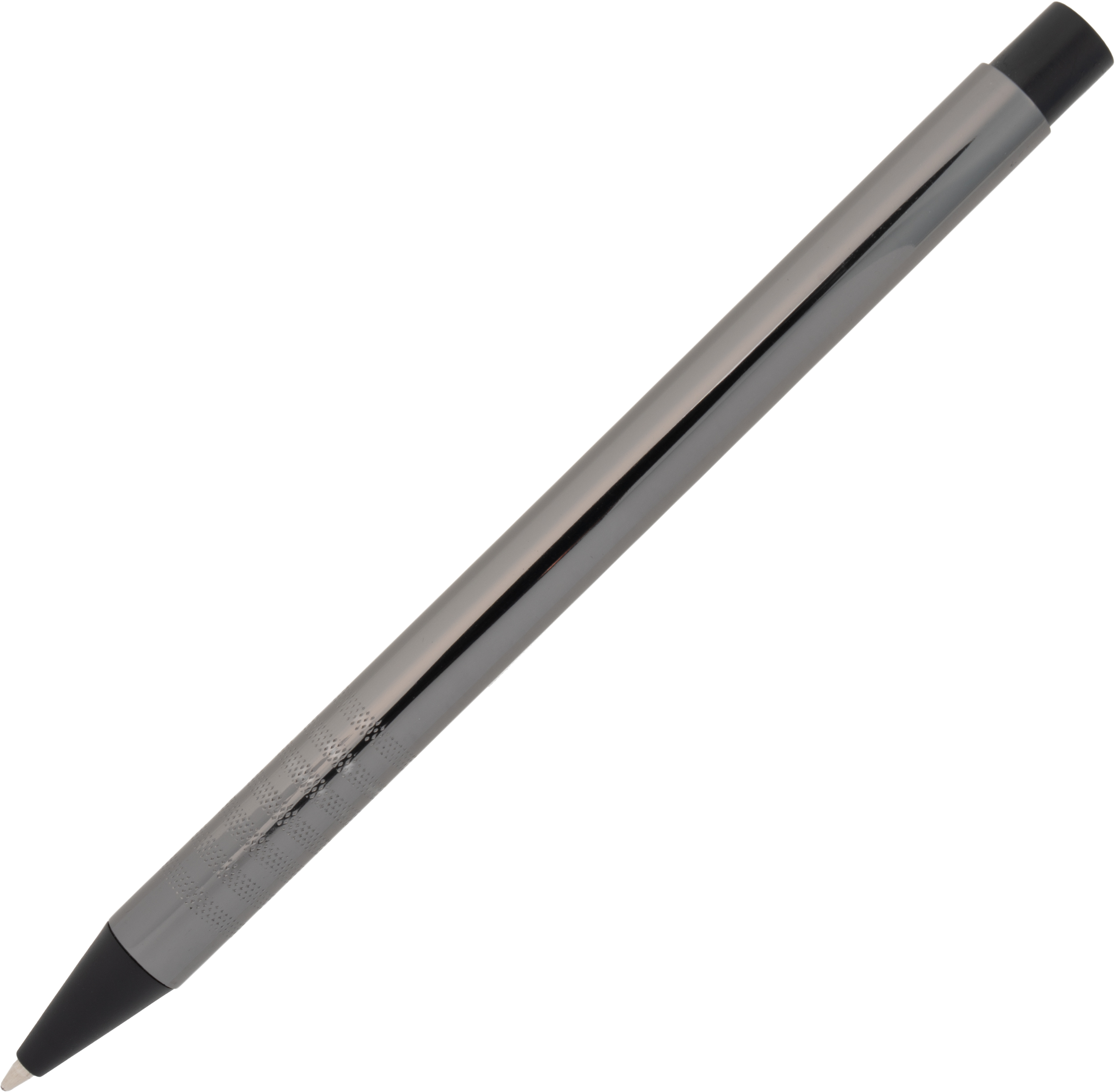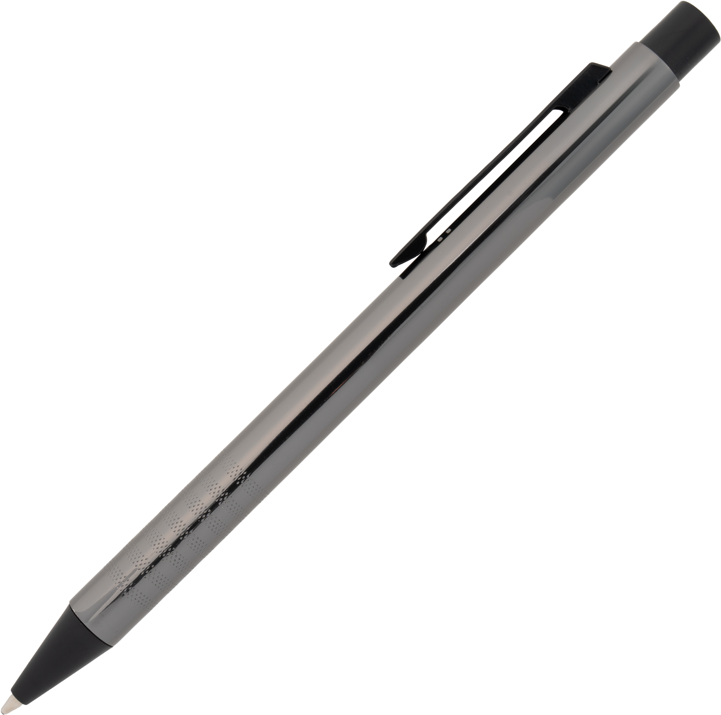 Metal ballpoint pen with blue writing refill and fancy grip zone. Your advertisement will be laser engraved to the right of the clip.