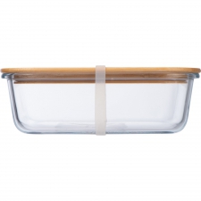 Borosilicate glasslunchbox with bamboo lid and flexible silicone strap. Your logo will be engraved onto the lid.
