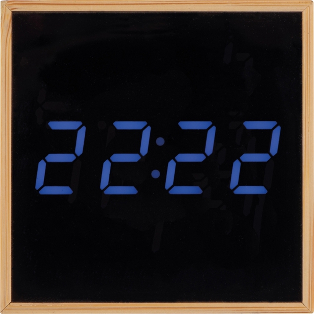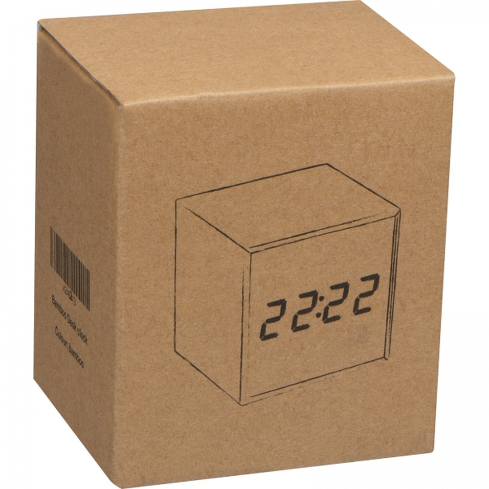 Elegant desk clock with wooden casing, black display and blue LED display showing time, date and temperature alternately. We will engrave your logo on the top.