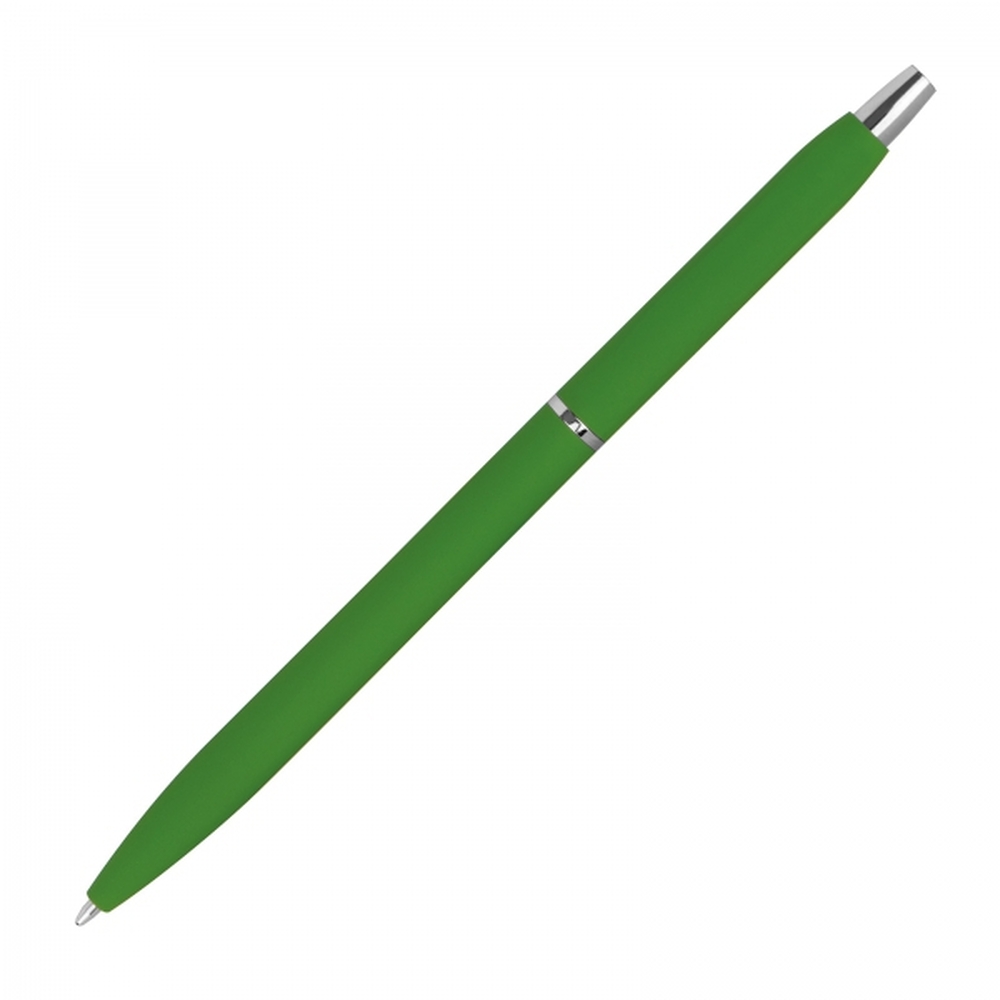 Slim, rubberized metal ball pen in different colors, with silver applications and black-writing refill. We will engrave your logo to the right of the clip.