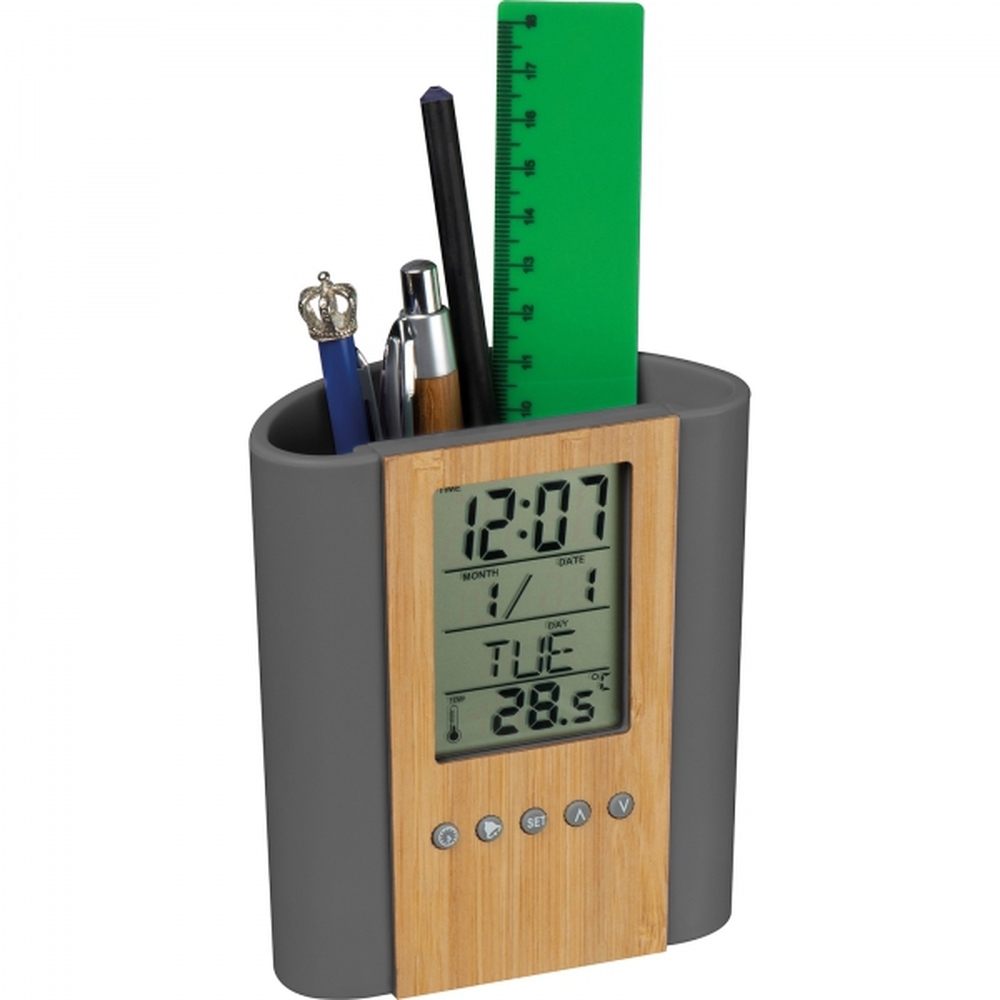 Desk Stand with Clock is the perfect blend of elegance, functionality, and modern technology, designed to fit seamlessly into any office or workspace. Made from high-quality materials with a bamboo front, it serves not only as a practical accessory but also as an aesthetic addition that brings harmony and style to your interior.Thanks to its multifunctionality, this stand not only acts as a container for pens and other office supplies but is also equipped with an advanced electronic clock offering a range of useful features. The clock not only displays the current time but also functions as a timer, alarm, calendar, thermometer, and reminder for important dates like birthdays.