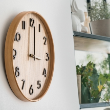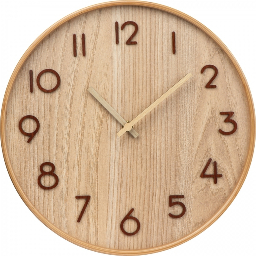 Wooden wall clock with hour and minute hands and convex numerals made of wood. Powered by AA batteries.