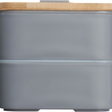 A set made of bamboo and plastic, which consists of: a box with two separate compartments (each with its own cover), a bamboo lid (which also serves as a cutting board or an outdoor plate), a divider (for separating individual parts of the meal within one compartment) and a knife, fork and a wide elastic band to close the box.