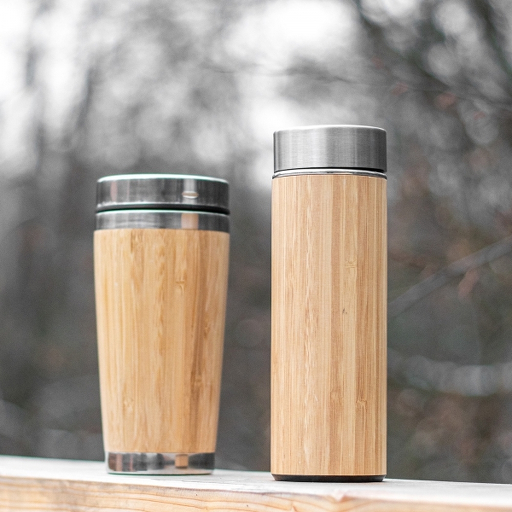 Set consisting of a double-walled bamboo drinking cup (360ml) and a double-walled-vacuum bamboo drinking bottle (450ml).