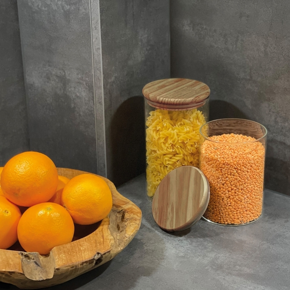 Storage jar made of borosilicate glass with a bamboo lid and silicone ring. Capacity of 1000 ml.