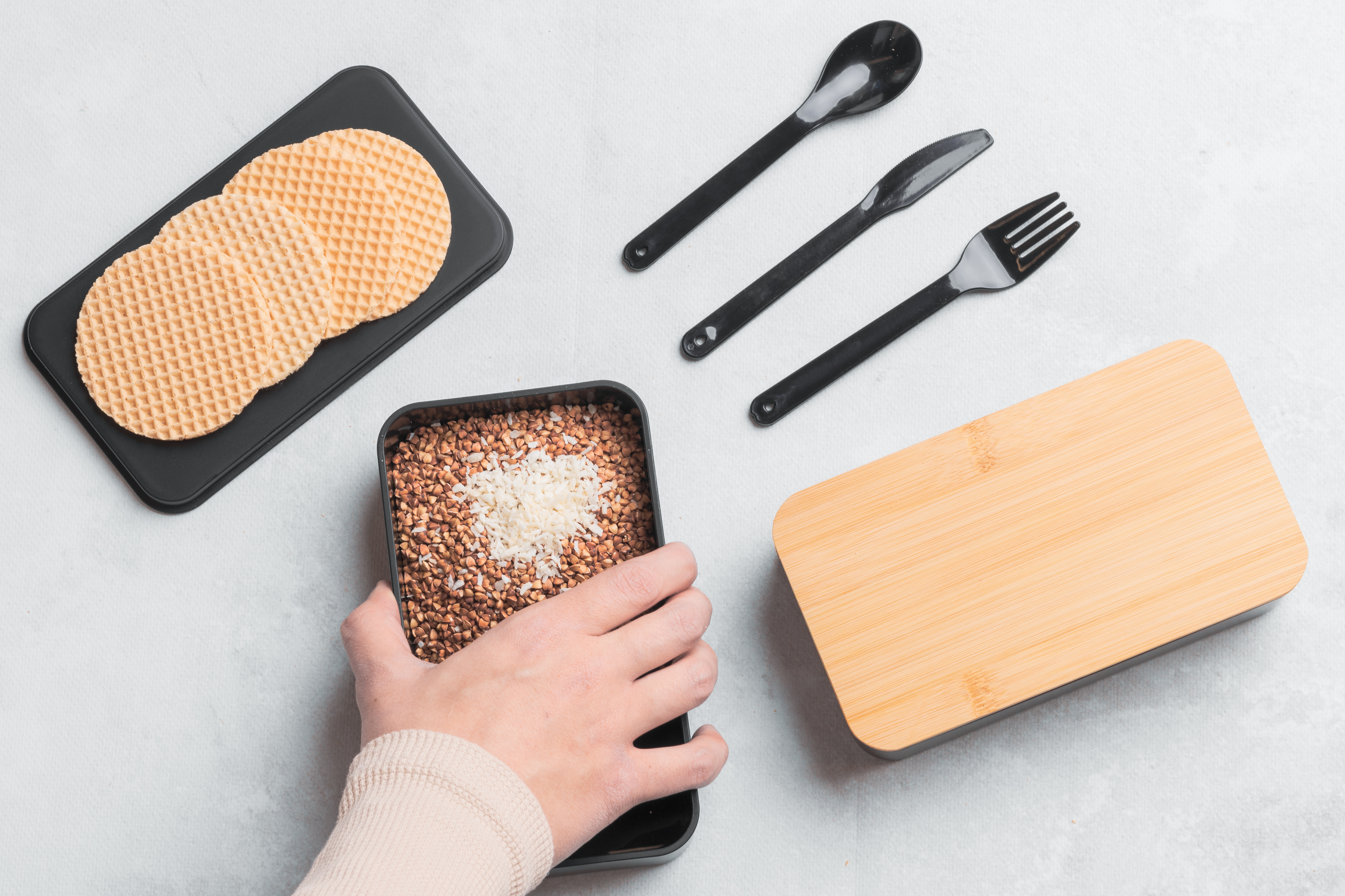 A set made of bamboo and plastic, which consists of: a box with two separate compartments (each with its own cover), a bamboo lid (which also serves as a cutting board or an outdoor plate), a divider (for separating individual parts of the meal within one compartment) and a knife, fork and a wide elastic band to close the box.
