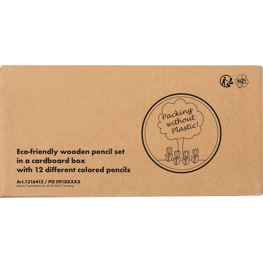 Eco-friendly wooden crayon set in cardboard packaging with 12 different coloured crayons.