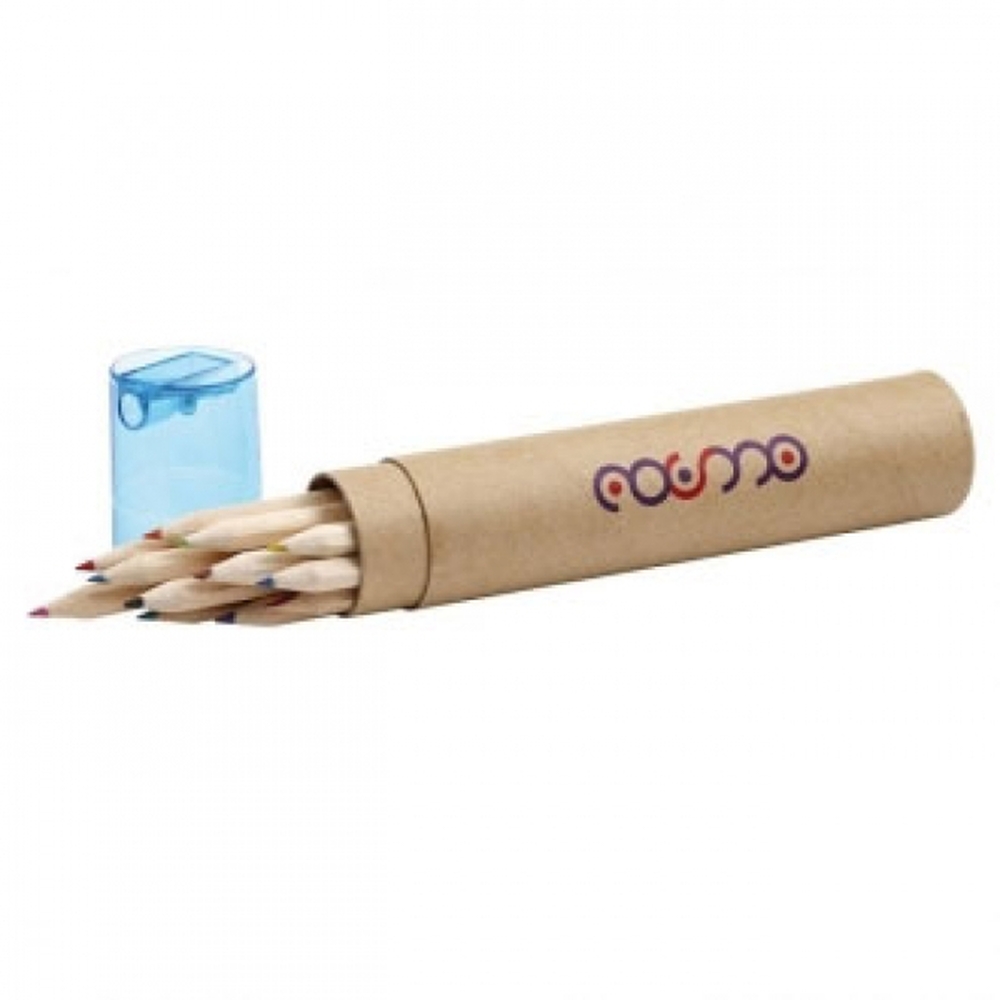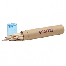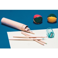 12 coloured pencils in a round paperboard quiver with sharpener.
