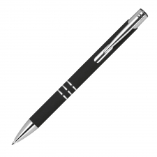 Its blue refill delivers smooth and clear writing, while the click mechanism ensures quick and easy ink advancement. The pen features a silver-finished clip and three rings that elegantly decorate its barrel. The soft-touch coating feels pleasant to the touch and allows for precise engraving, making this gadget ideal for brand promotion.