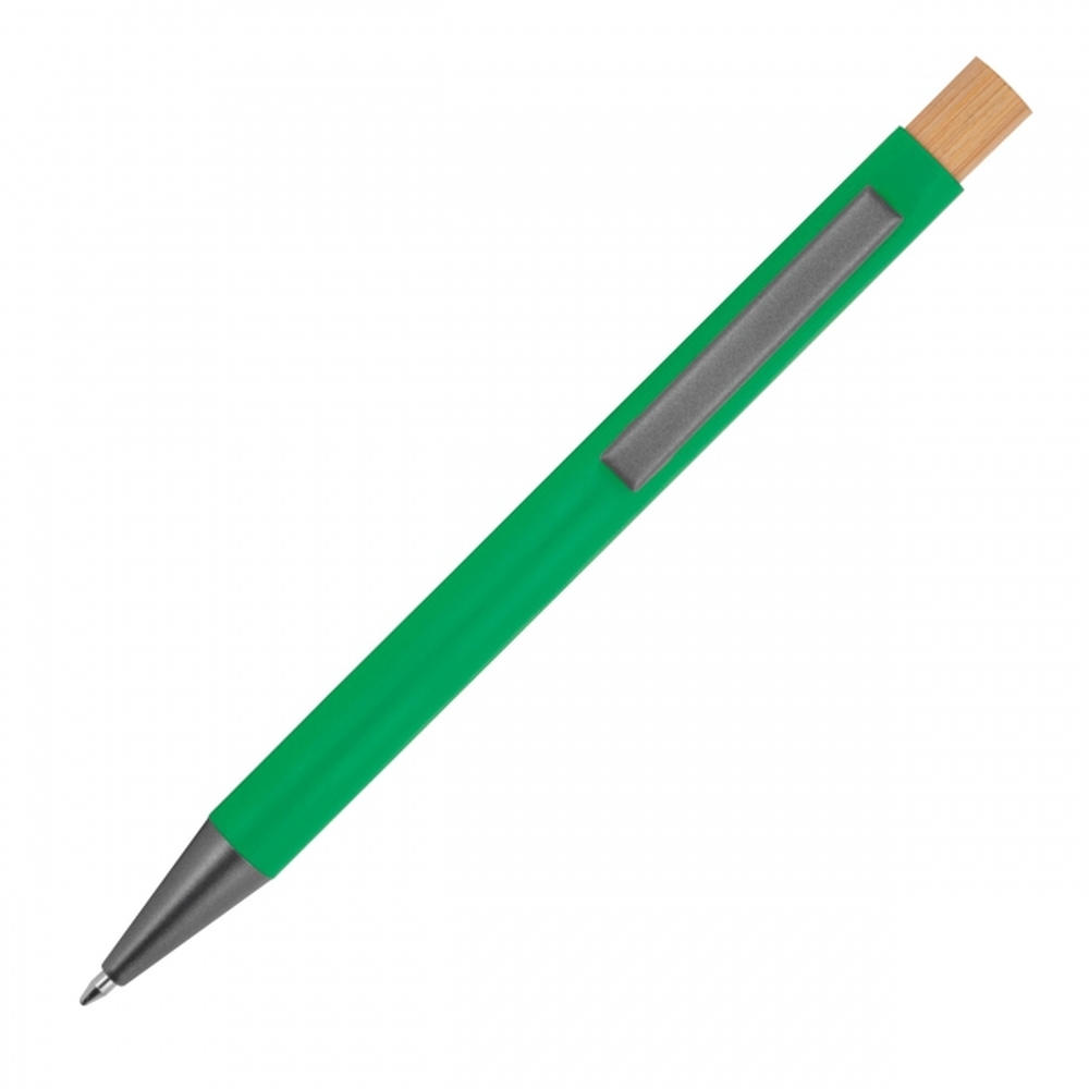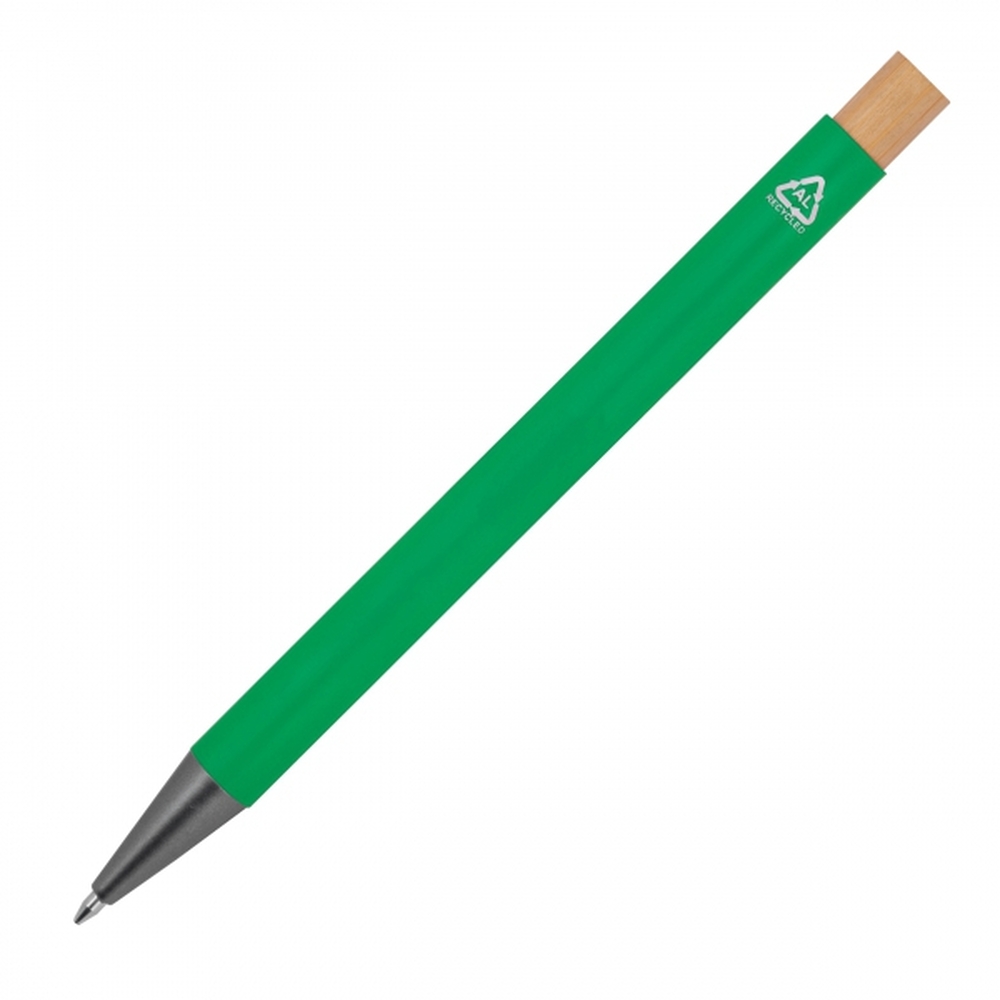 Recycled aluminium pen with bamboo pusher, metal clip and large capacity refill with blue ink. Your advertising is engraved to the right of the clip.