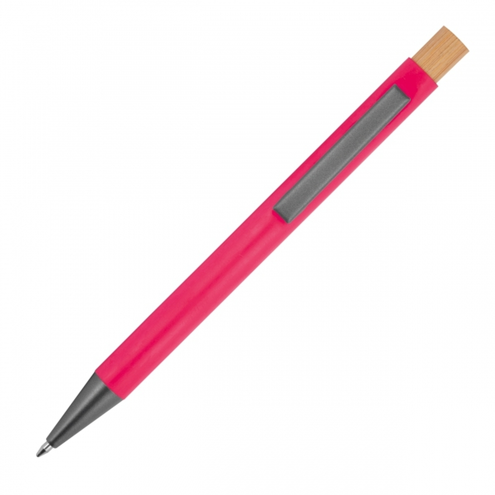 Recycled aluminium pen with bamboo pusher, metal clip and large capacity refill with blue ink. Your advertising is engraved to the right of the clip.