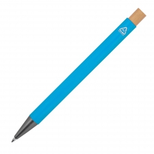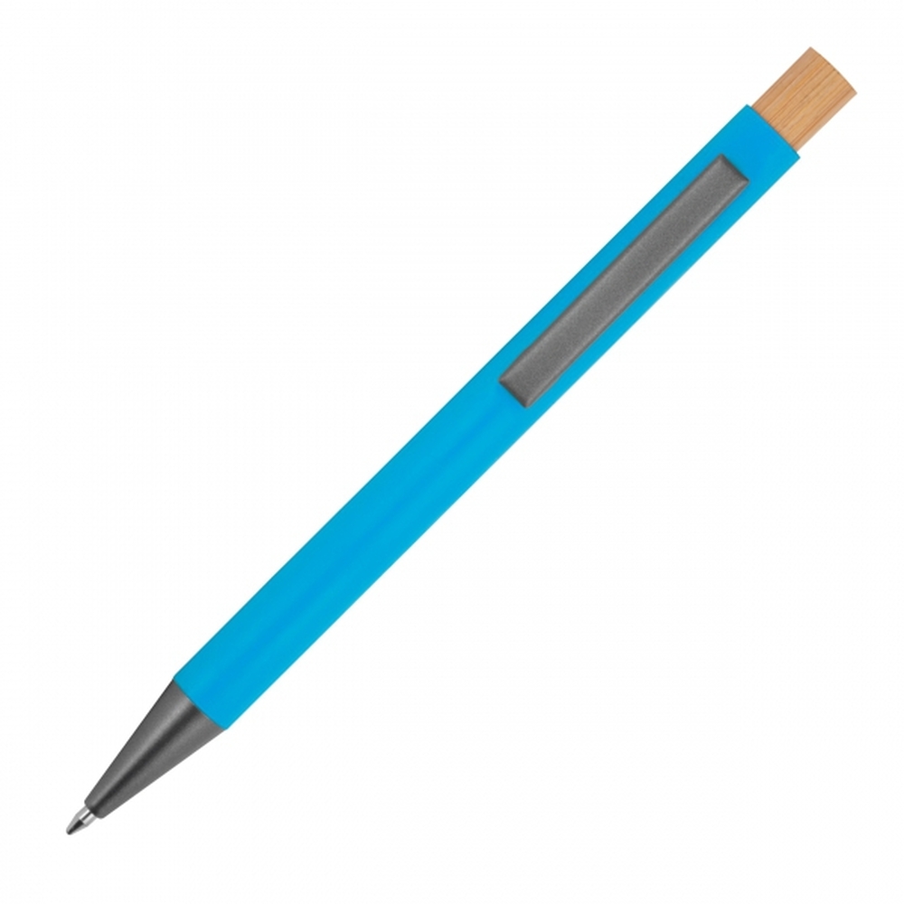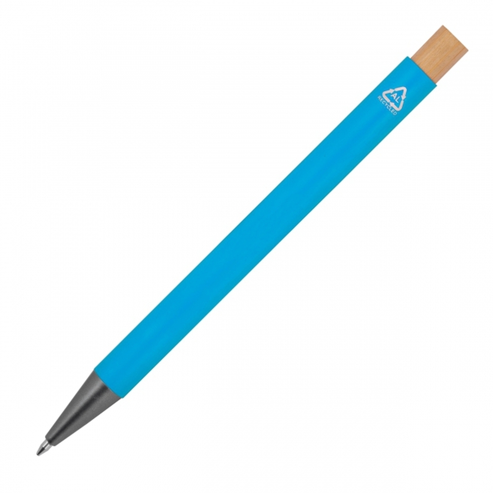 Recycled aluminium pen with bamboo pusher, metal clip and large capacity refill with blue ink. Your advertising is engraved to the right of the clip.