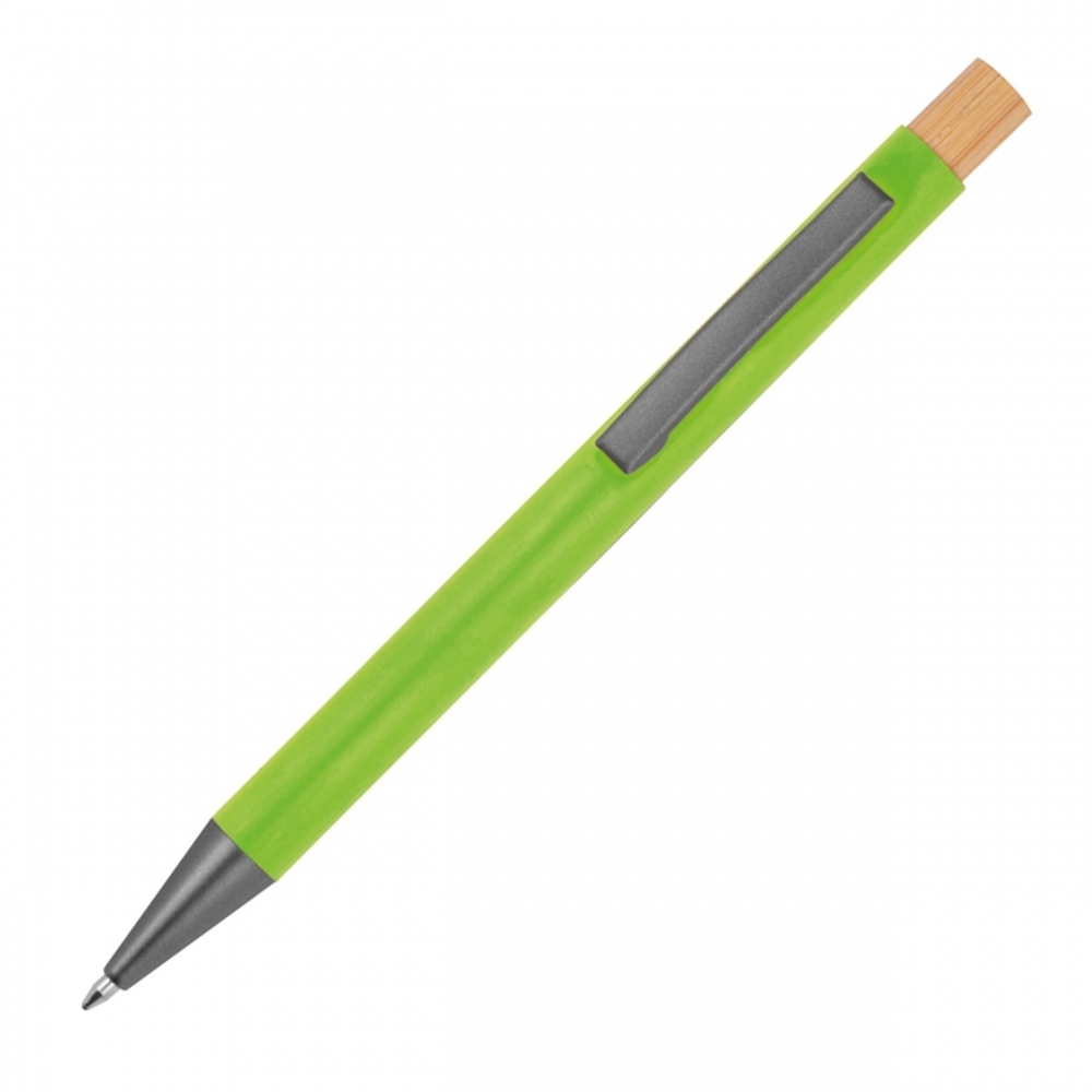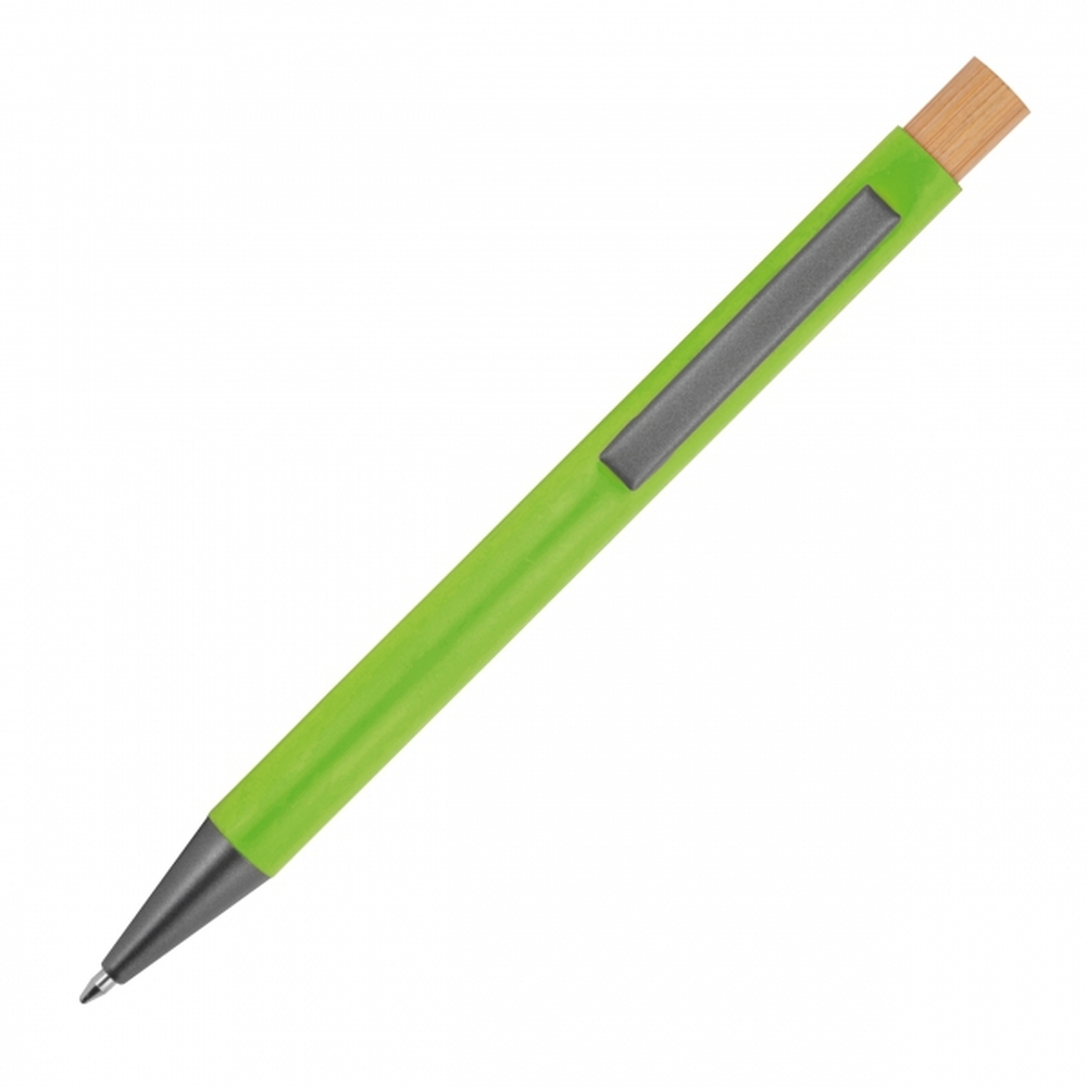 Recycled aluminium pen with bamboo pusher, metal clip and large capacity refill with blue ink. Your advertising is engraved to the right of the clip.