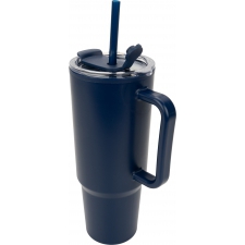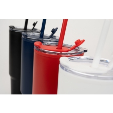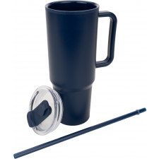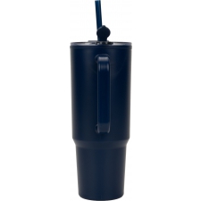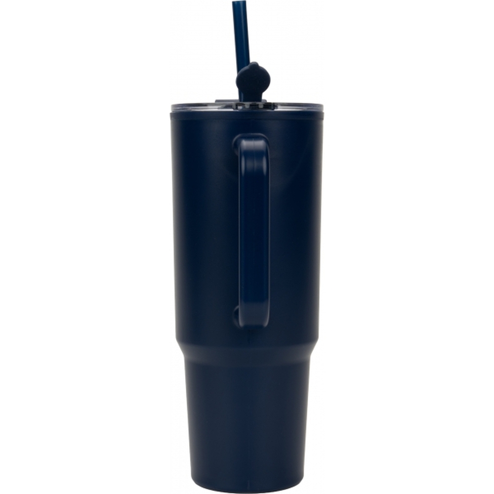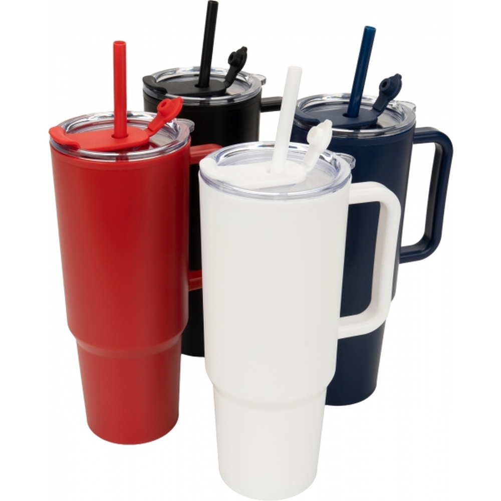 Double-walled XXL plastic drinking cup with a capacity of 1200ml, practical carrying handle and removable straw in the lid.
