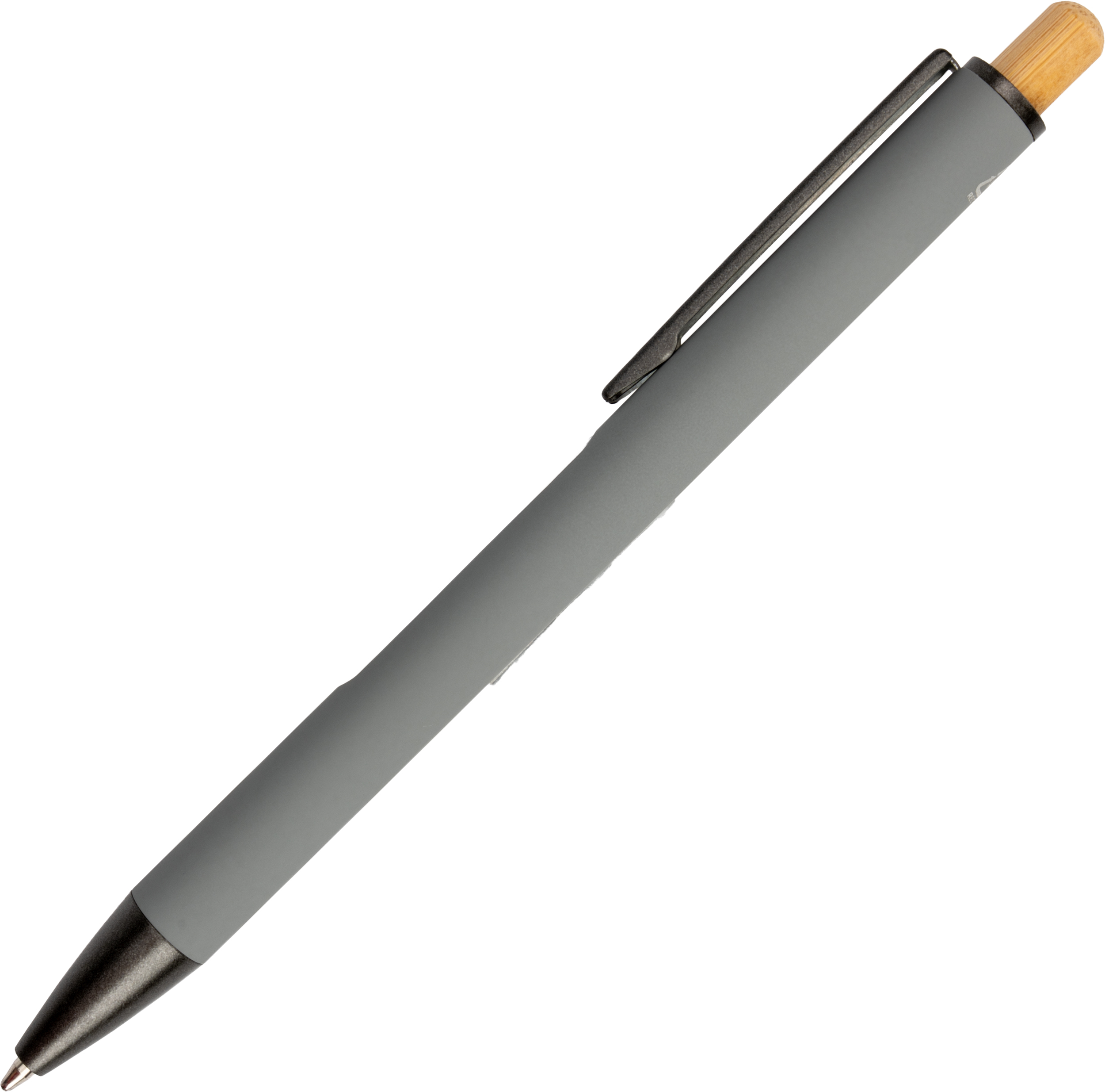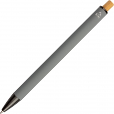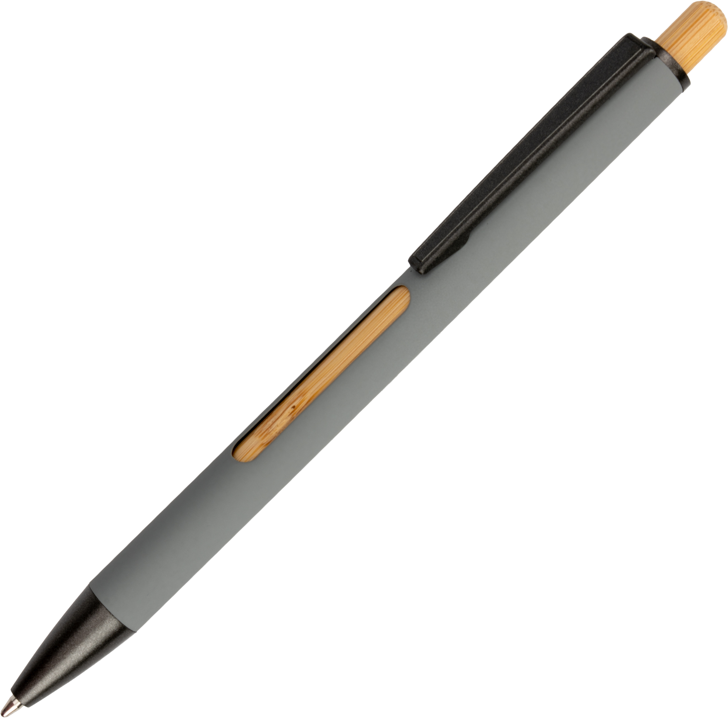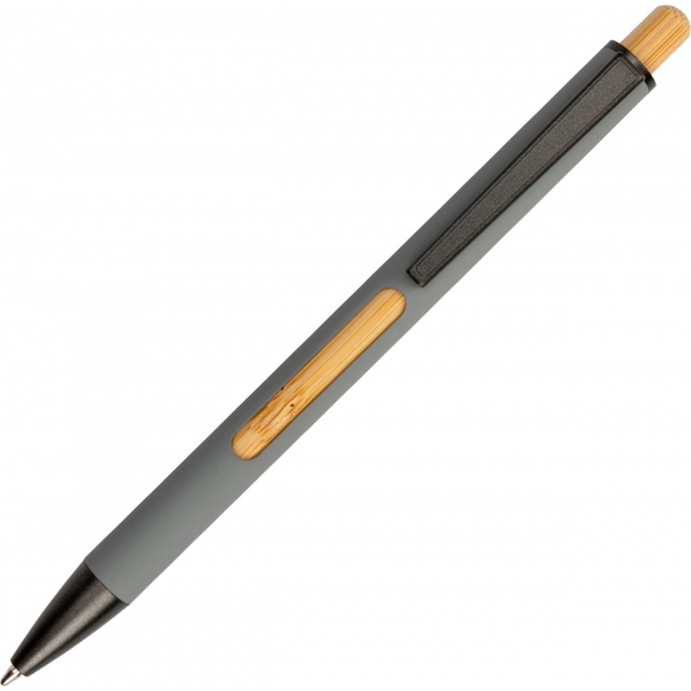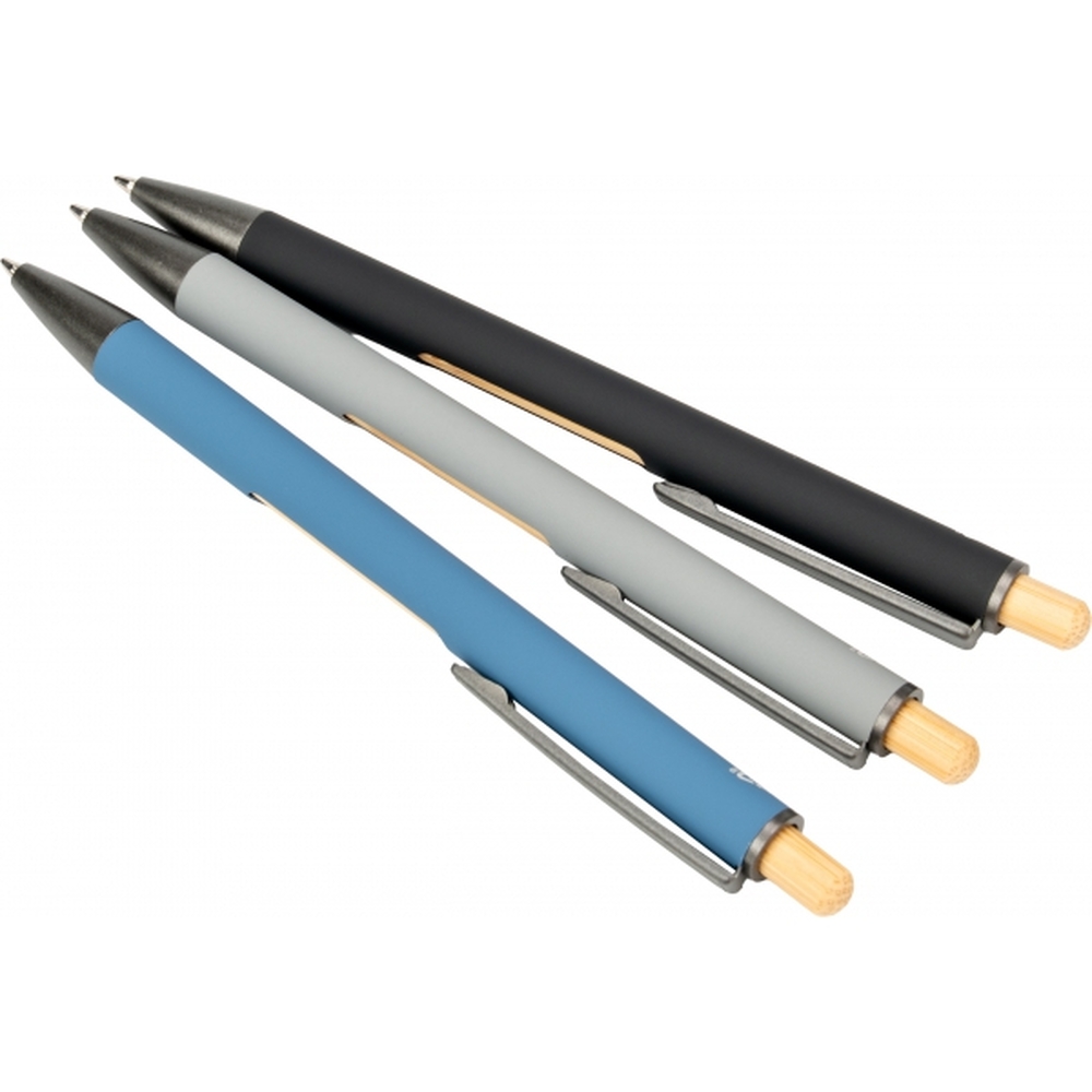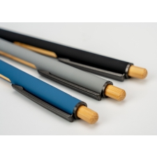 Recycled aluminium ballpen with black metal clip, blue refill, bamboo pusher and bamboo window at the height of the clip.