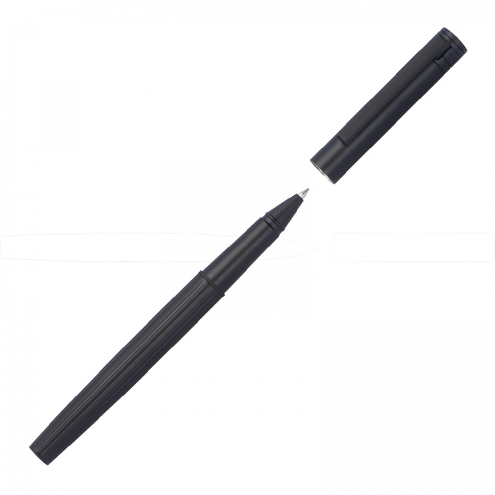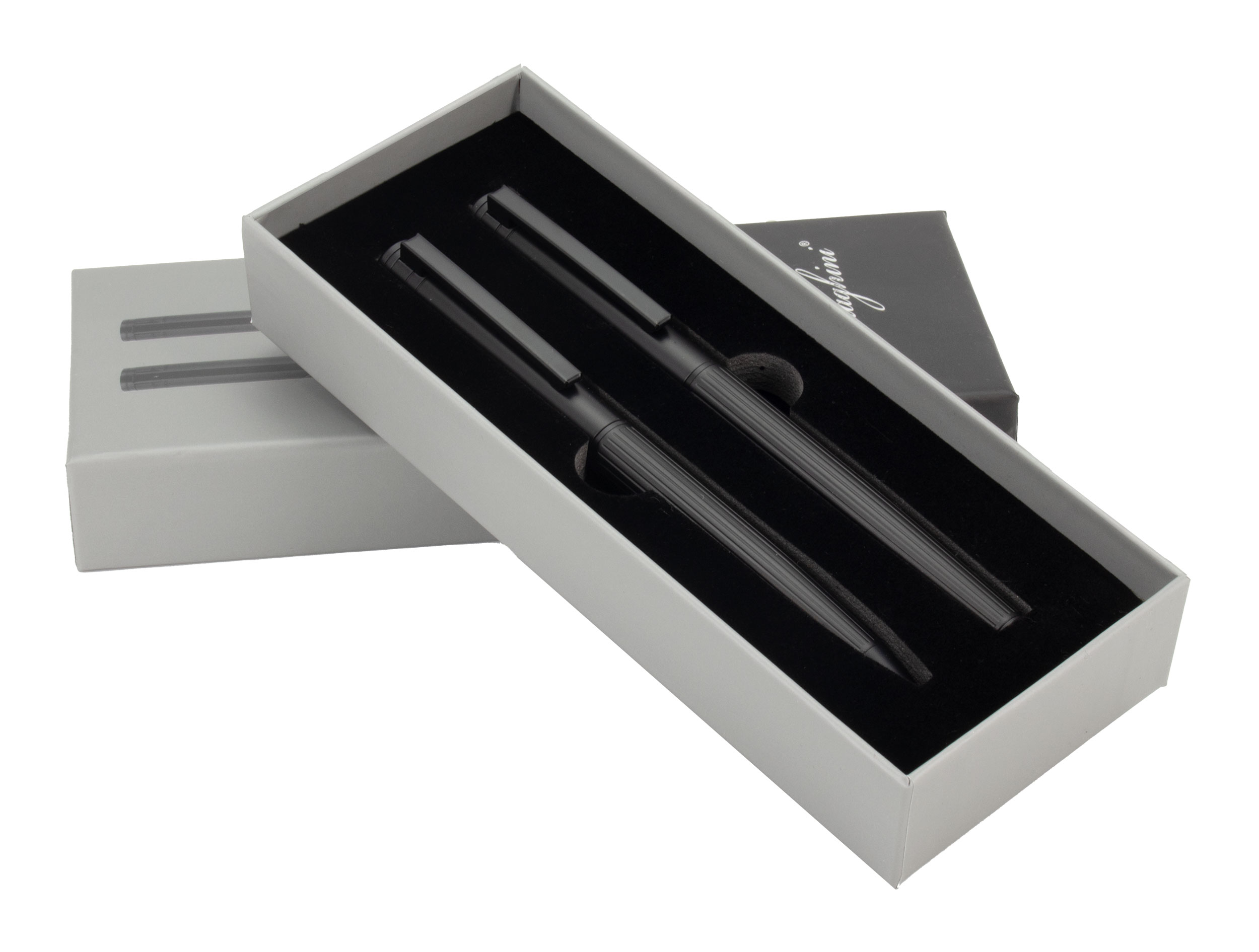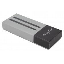 Elegant writing set by Ferraghini is a unique duo of a ballpoint pen and a rollerball pen, designed for the most demanding business clients. Both writing instruments are made from durable metal, with a ribbed surface that adds a distinctive character and ensures a secure grip. Both the ballpoint pen and the rollerball pen write in blue ink.