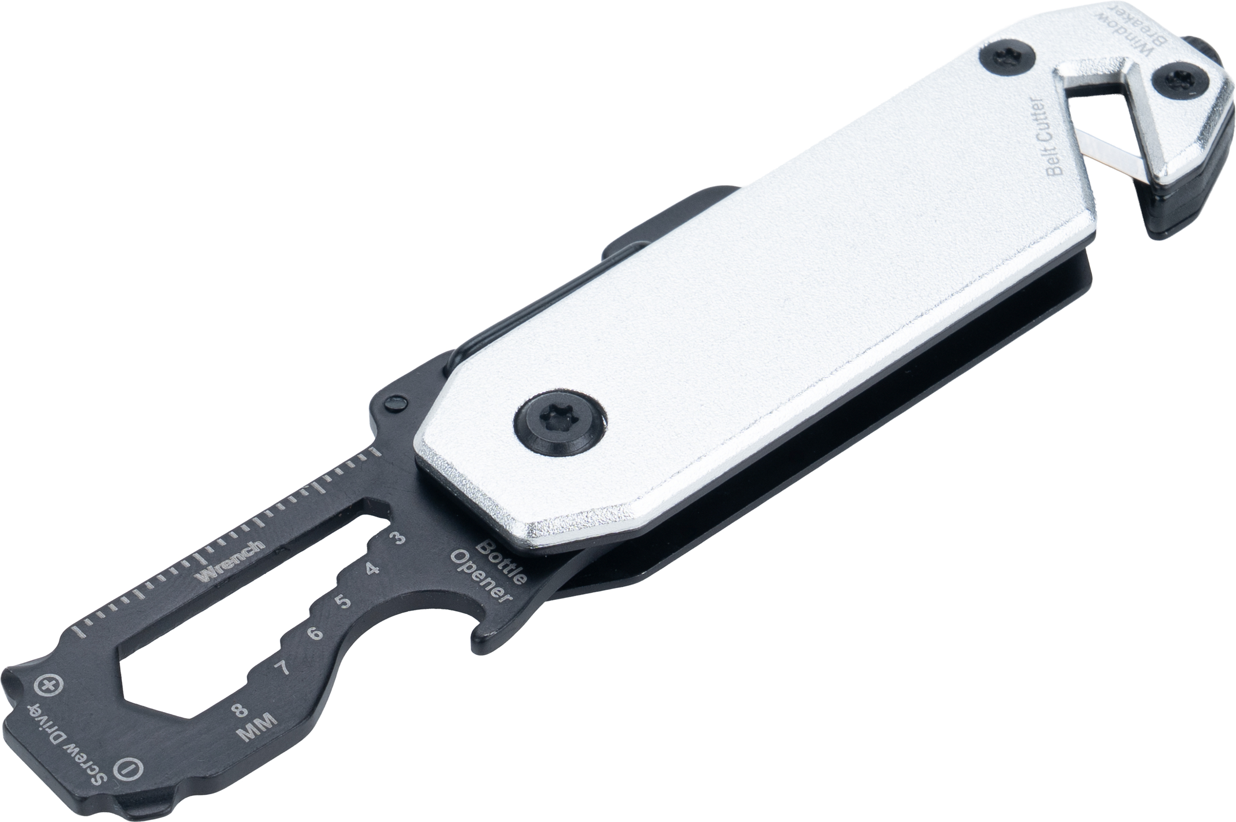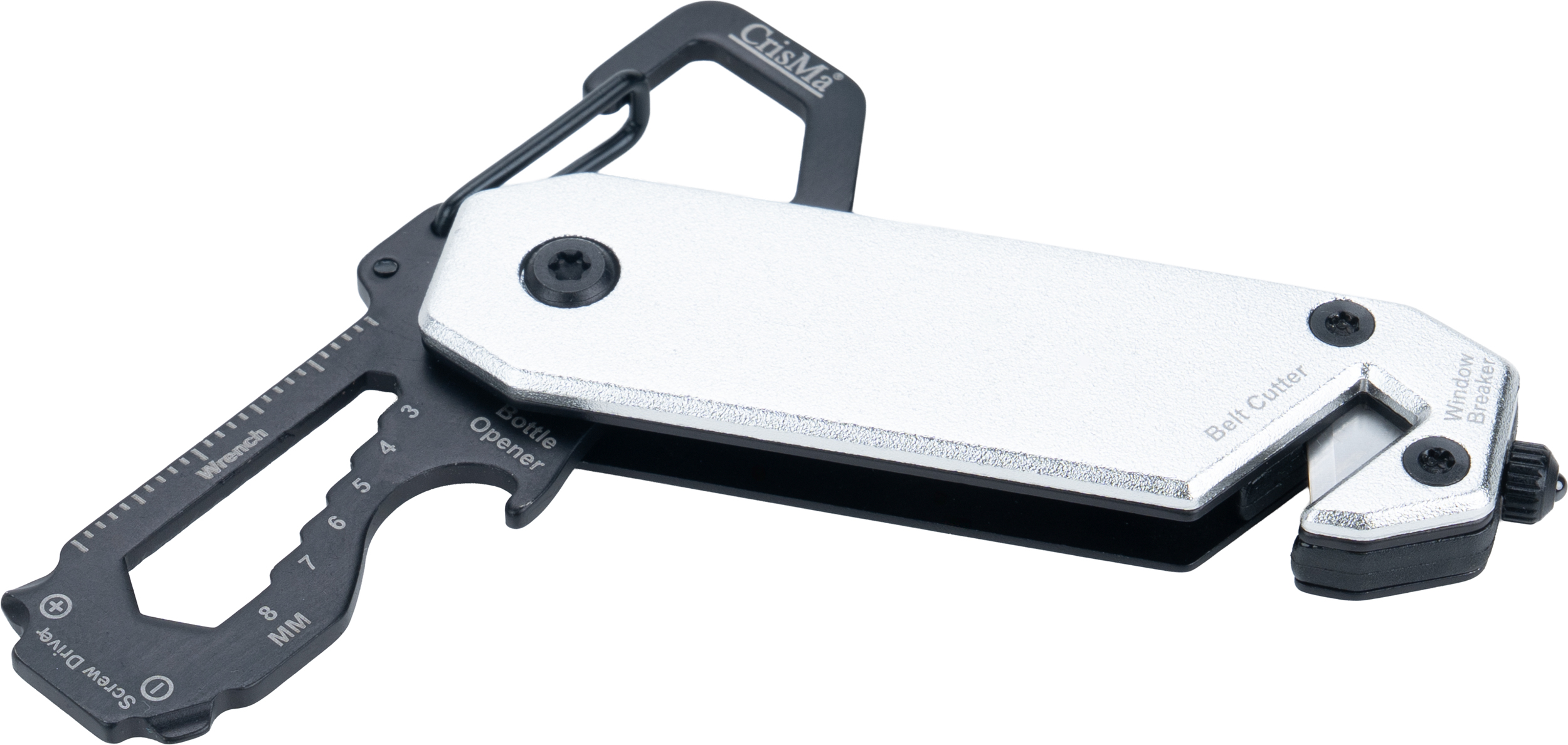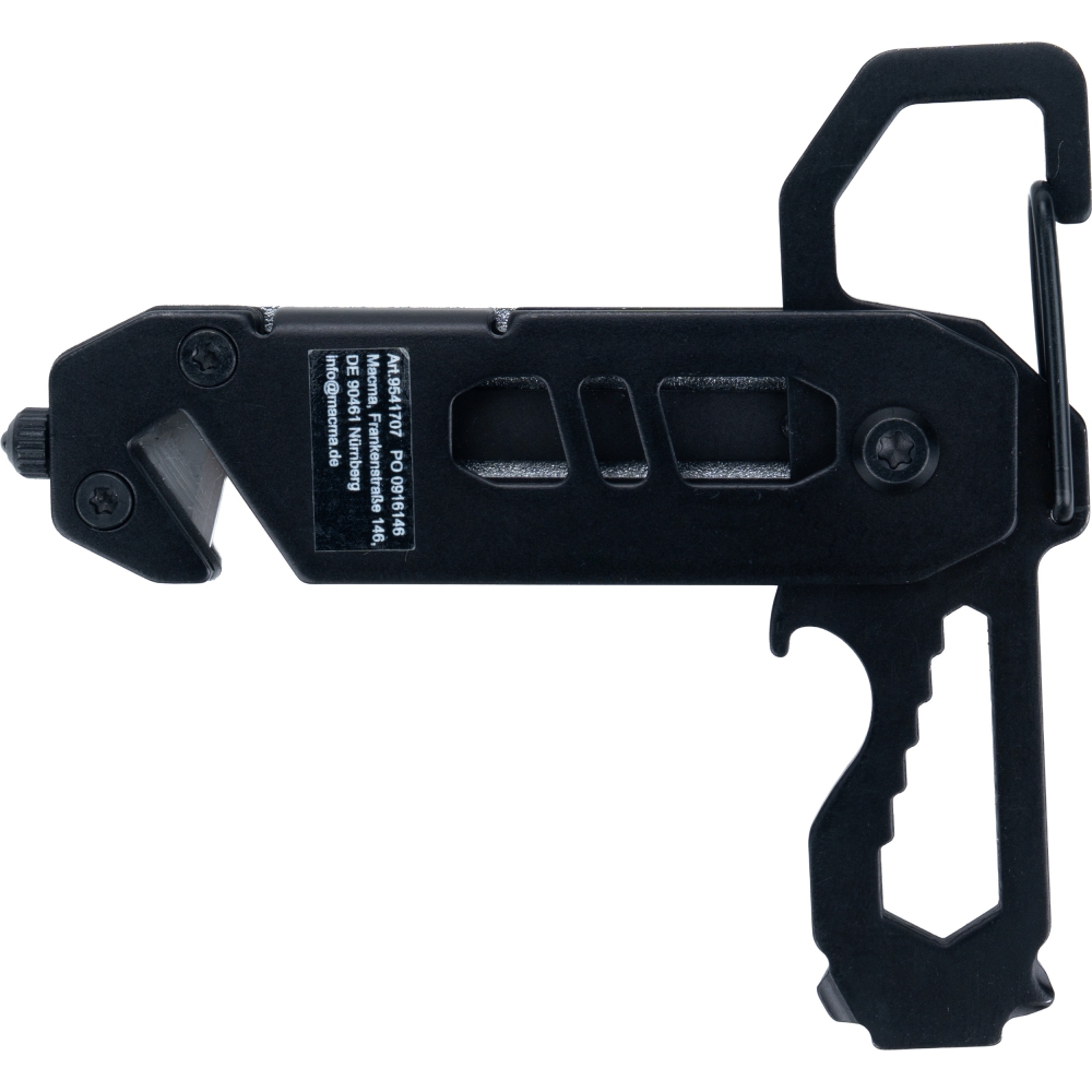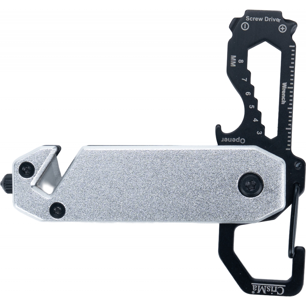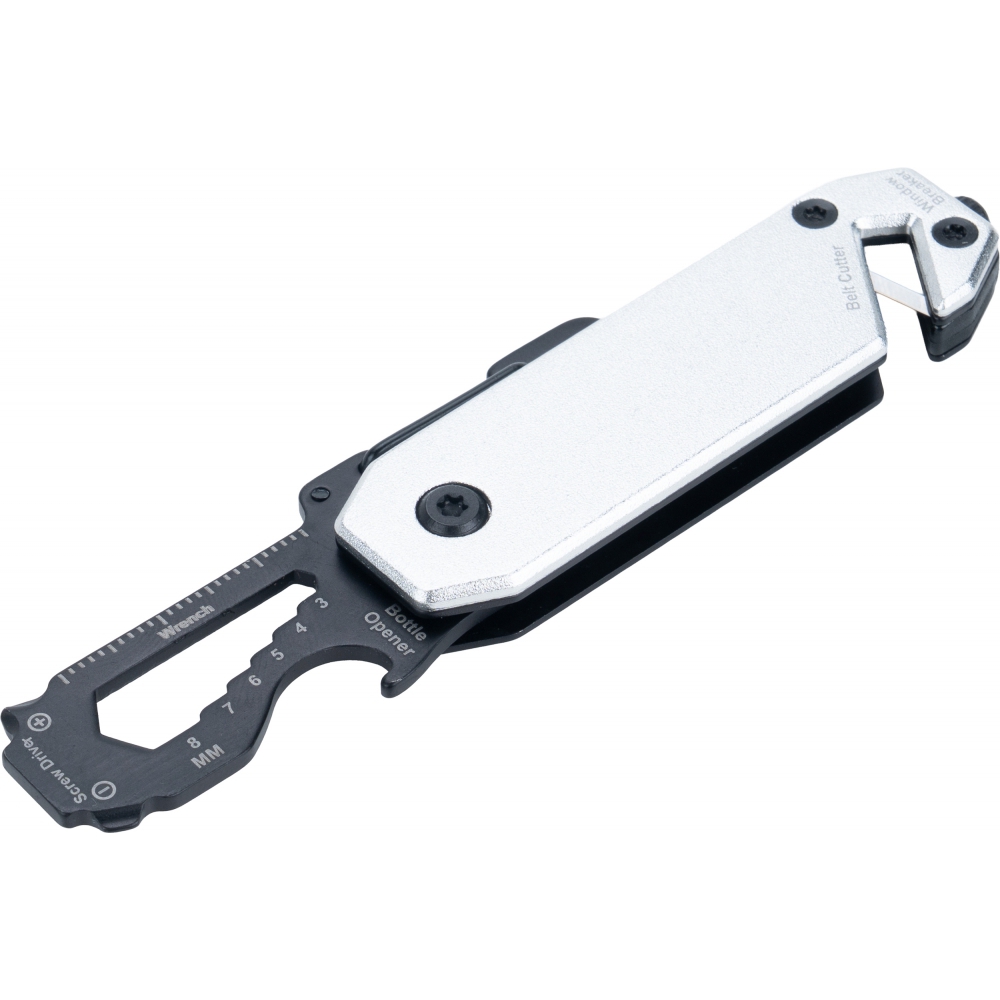 Multitool with an aluminum casing and stainless steel tools. Equipped with 3–8 mm wrenches, Phillips screwdriver, flathead screwdriver, carabiner, bottle opener, seatbelt cutter, and safety hammer for breaking glass.