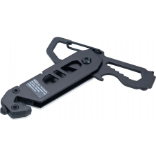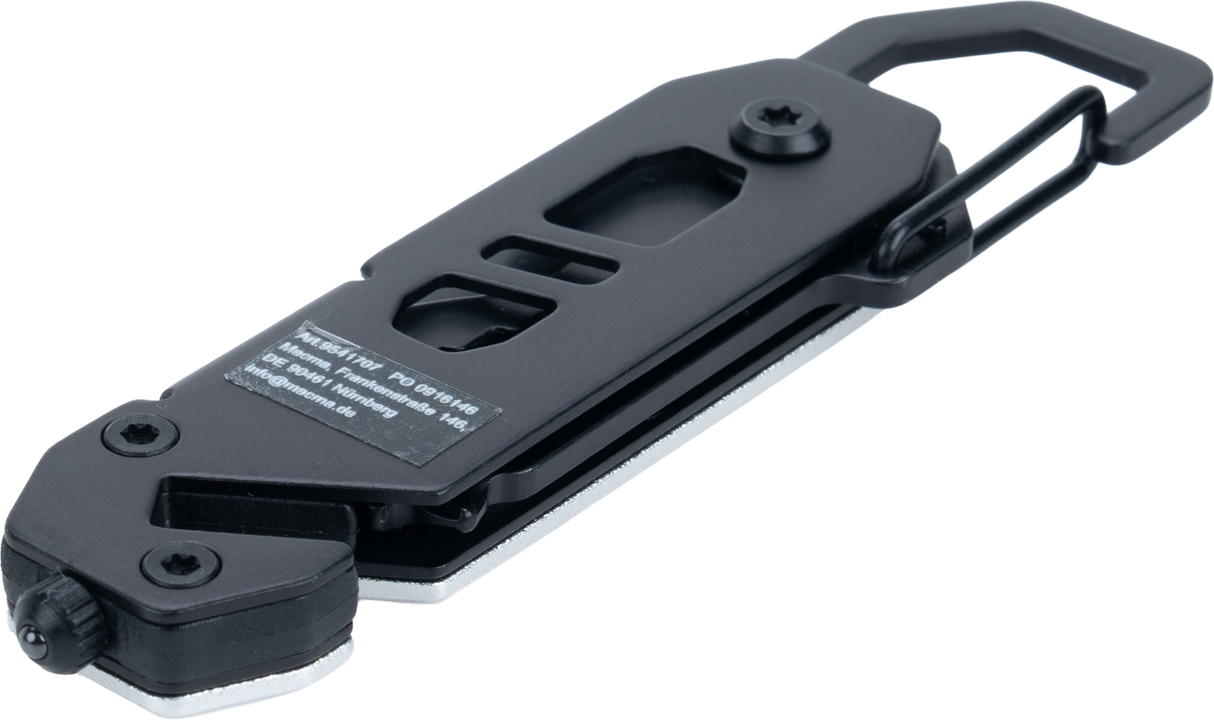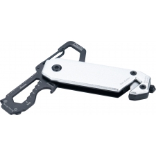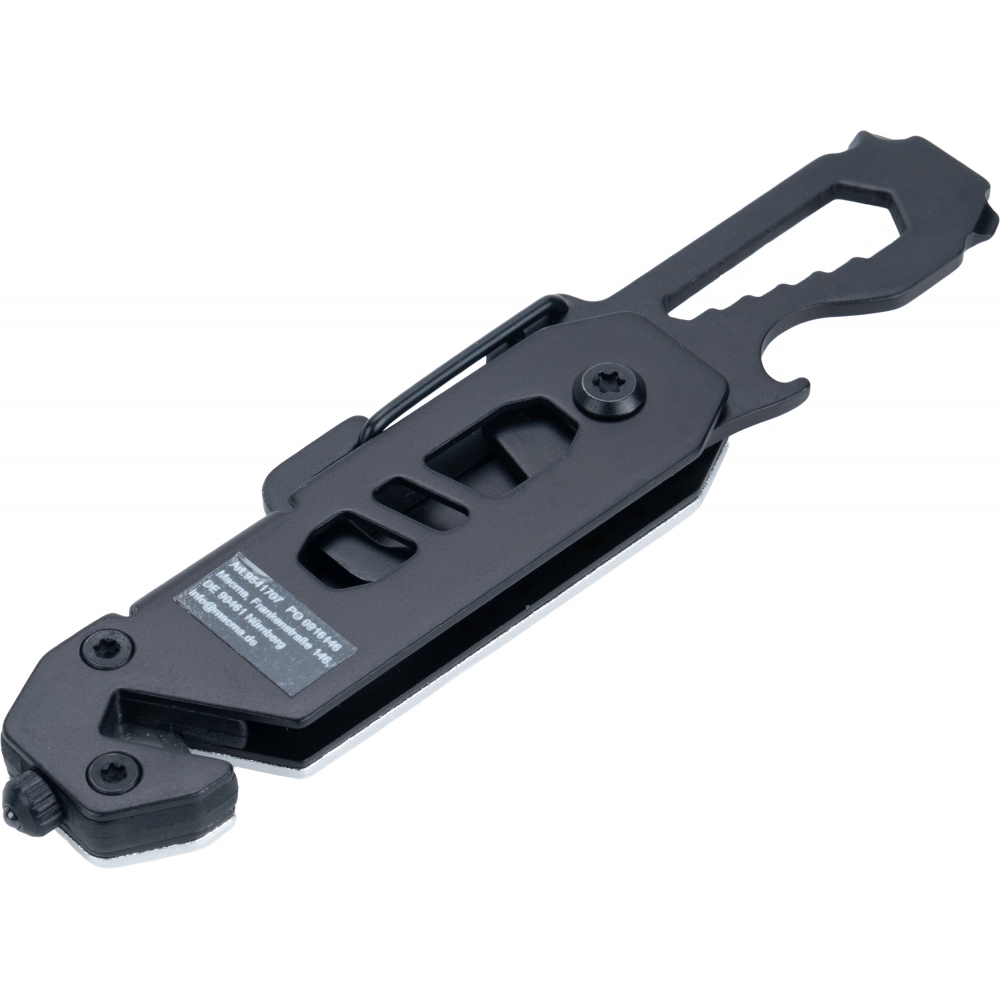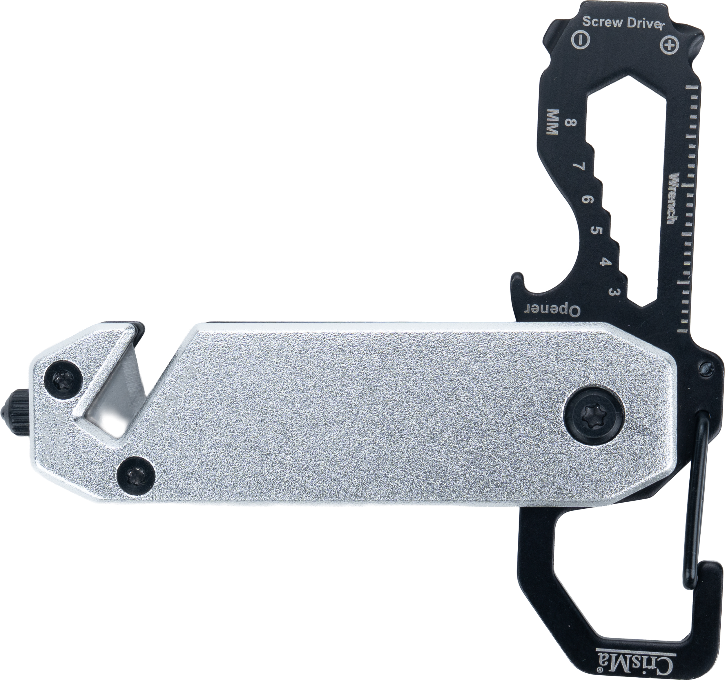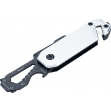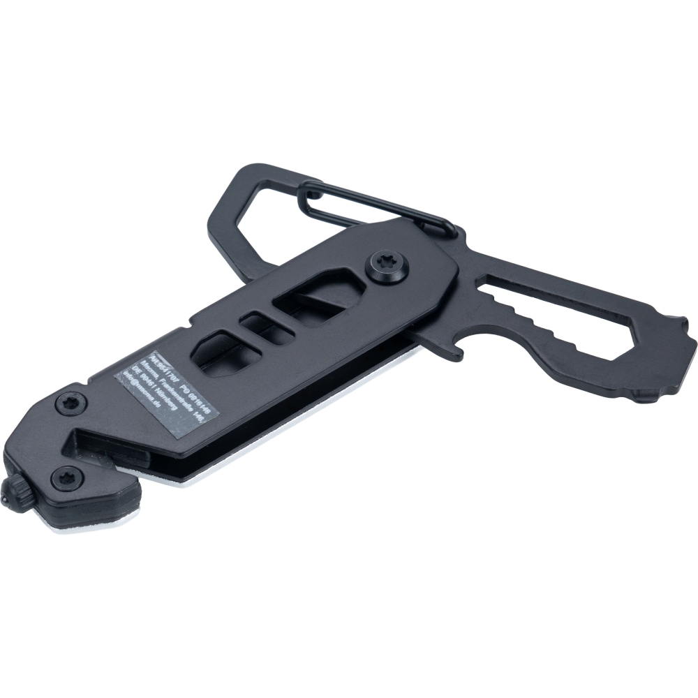Multitool with an aluminum casing and stainless steel tools. Equipped with 3–8 mm wrenches, Phillips screwdriver, flathead screwdriver, carabiner, bottle opener, seatbelt cutter, and safety hammer for breaking glass.