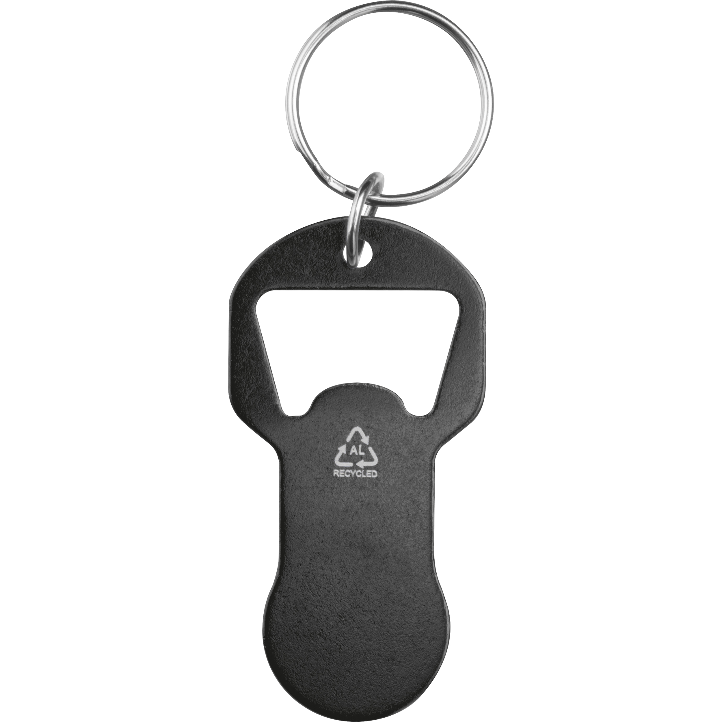 Keychain made of recycled aluminum with integrated bottle opener and shopping cart token. Lightweight, practical, and ideal for everyday use.