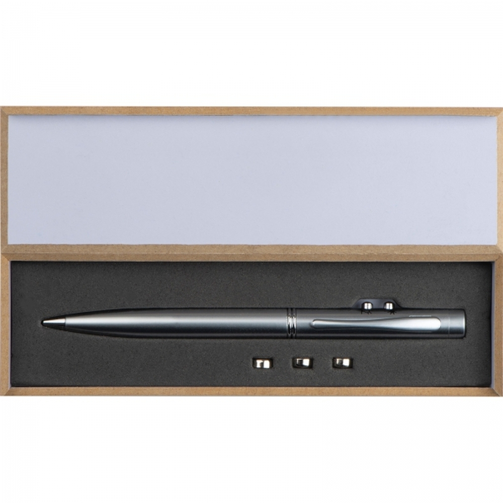 Metal pen with laser pointer is an innovative blend of elegance and functionality. Equipped with a blue ink refill, it ensures smooth writing, and additionally features a laser pointer and an LED light, making it an extremely practical tool for presentations and everyday use.