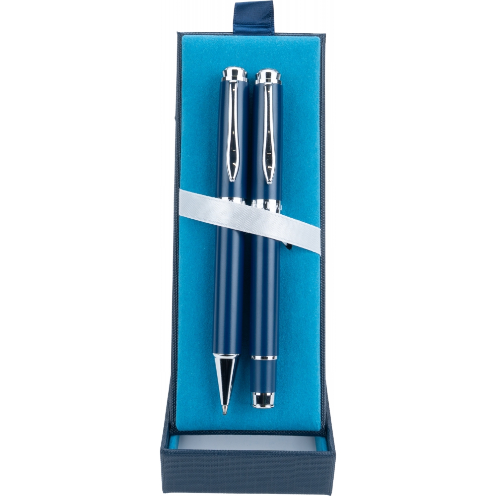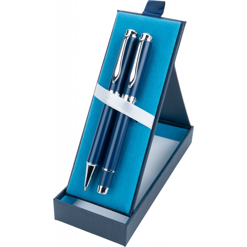 Exclusive writing set consisting of a metal ballpoint pen and a rollerball pen in an elegant folding box.