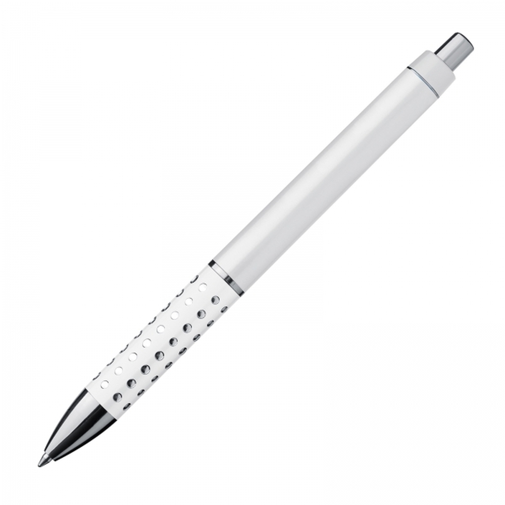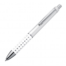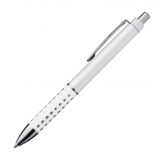 Plastic ball pen with sparkling dot grip zone and a large blue refill.