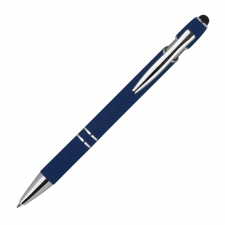 Metal balll pen with silver applications, blue writing refill, touch function and patterned grip zone.