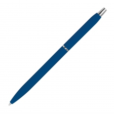 Slim, rubberized metal ball pen in different colors, with silver applications and blue-writing refill. We will engrave your logo to the right of the clip.