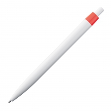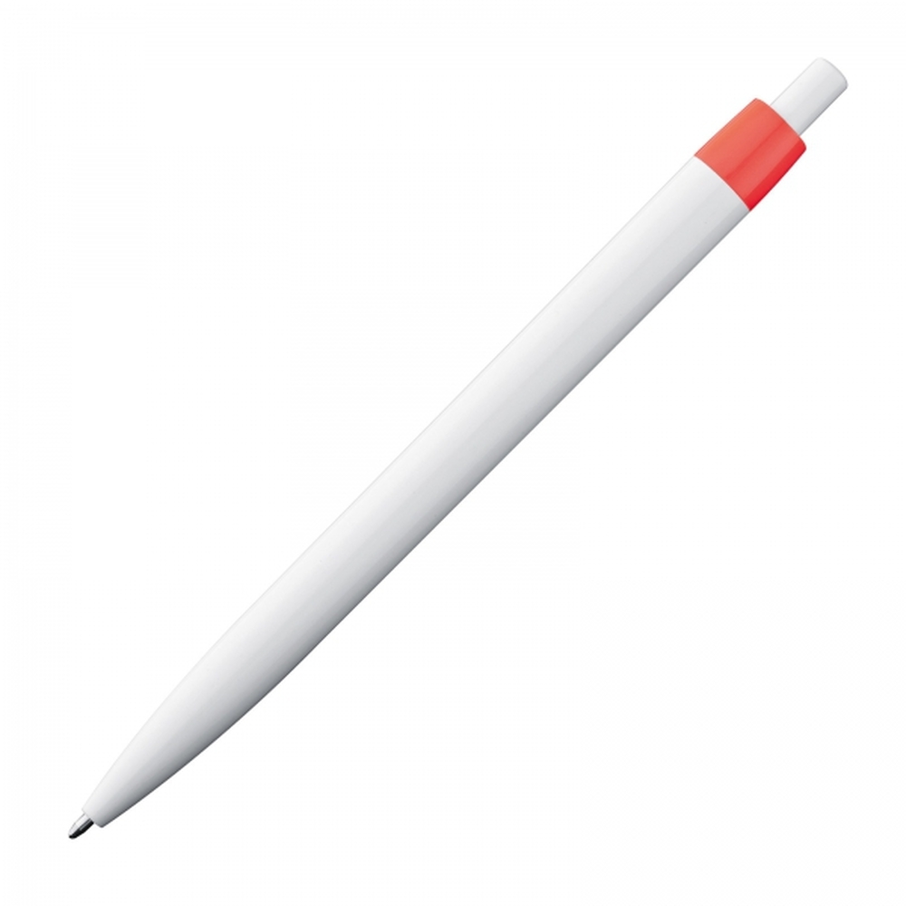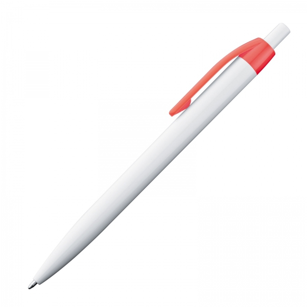 Trendy push-button ball pen with a blue-writing plastic refill. Due to the white body, the luminous clip colours appear even more striking.