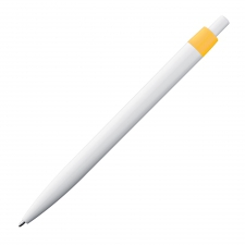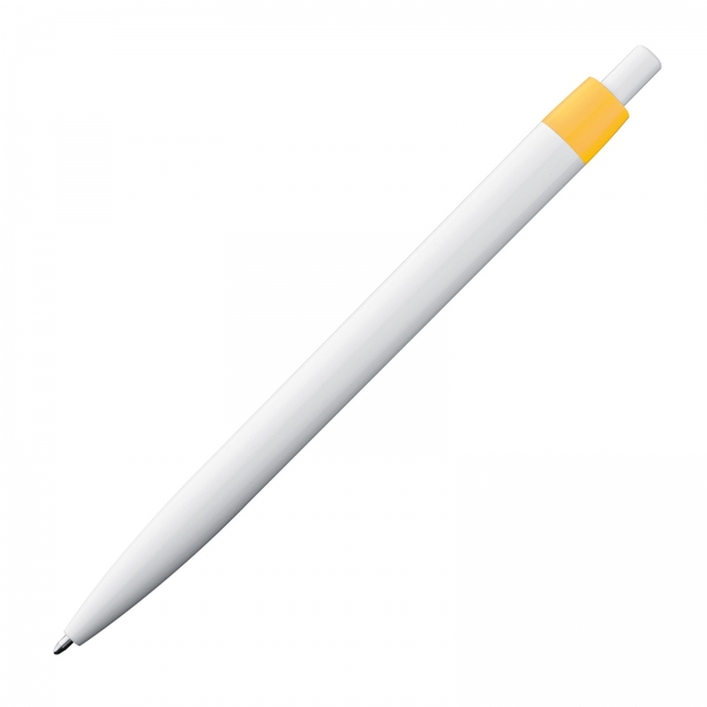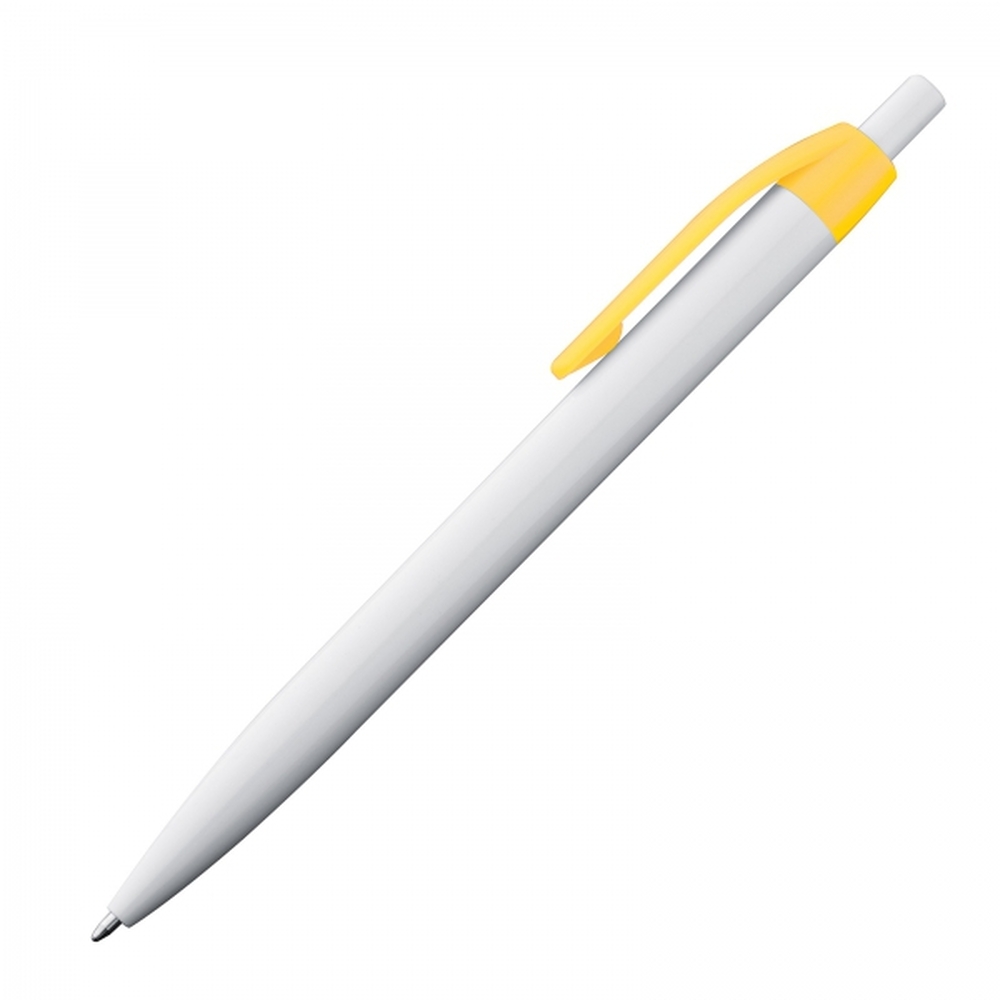 Trendy push-button ball pen with a blue-writing plastic refill. Due to the white body, the luminous clip colours appear even more striking.