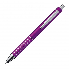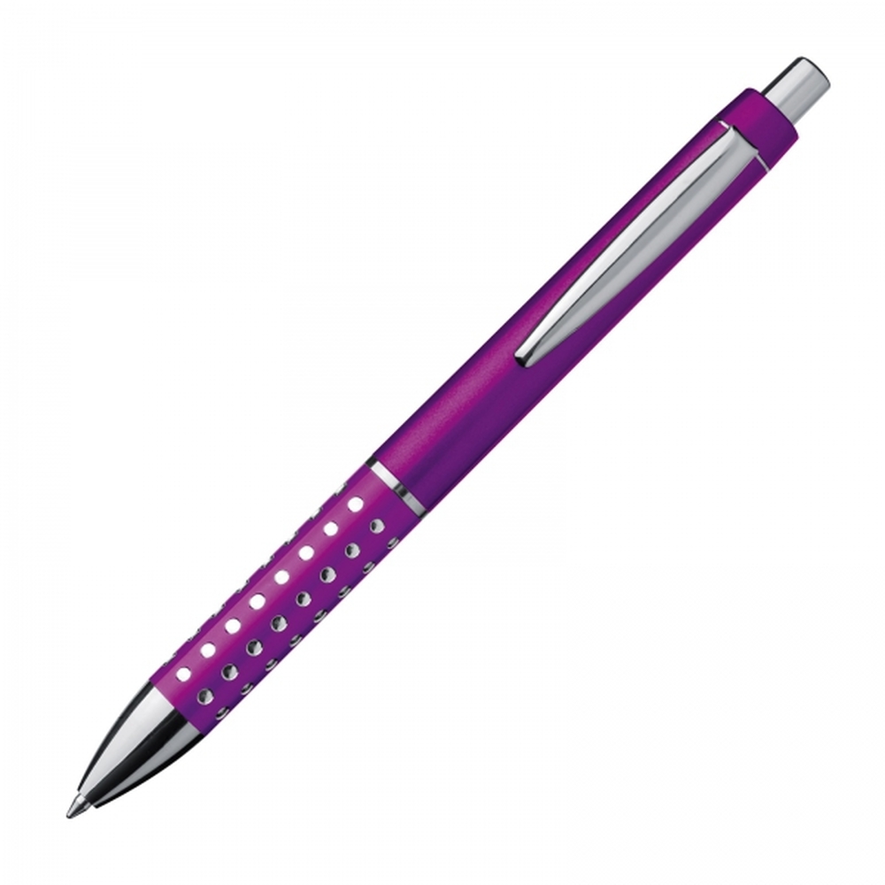Plastic ball pen with sparkling dot grip zone and a large blue refill.