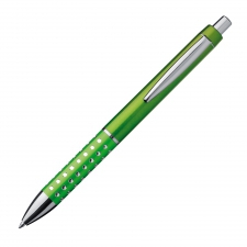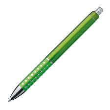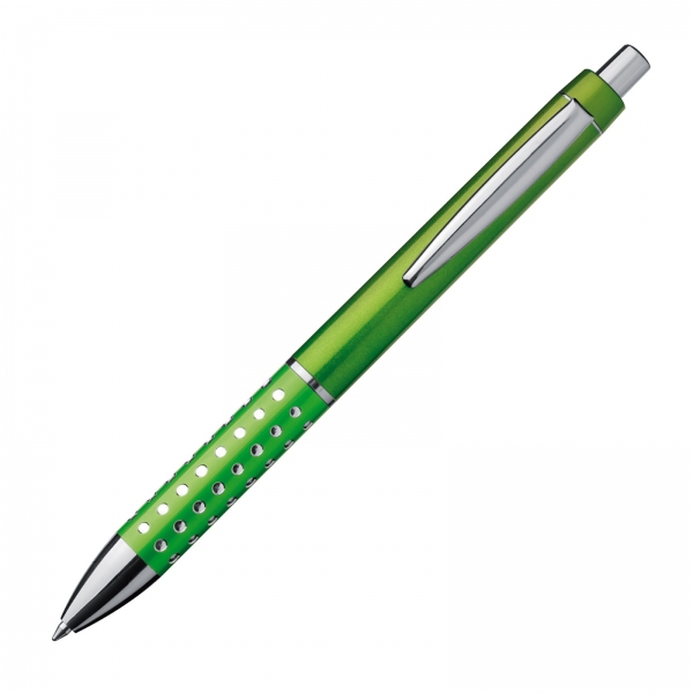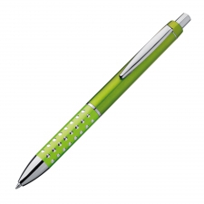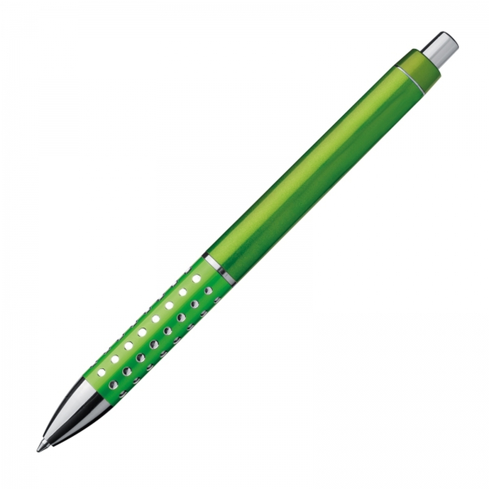 Plastic ball pen with sparkling dot grip zone and a large blue refill.