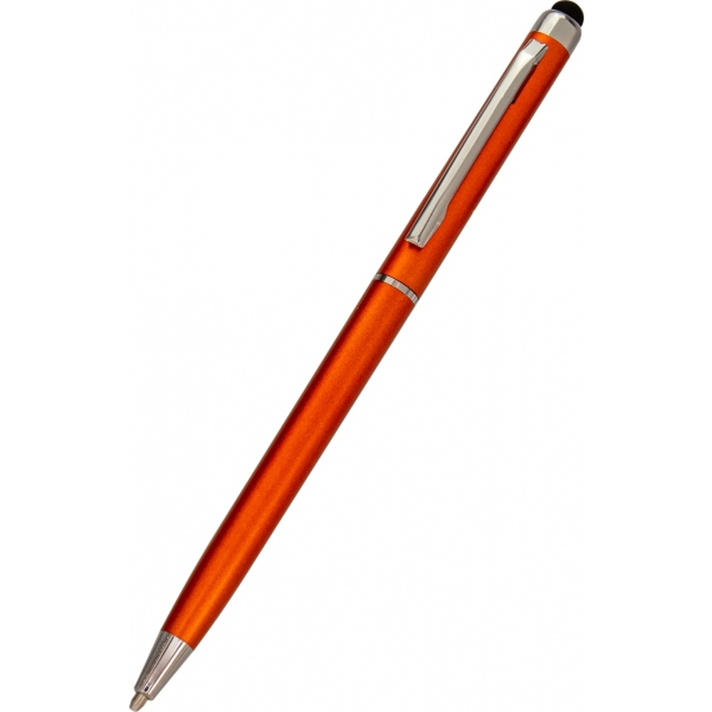 Rotary ball pen made of plastic in elegant slim shape, providing a blue-writing refill and a practical touch pad for effortless handling of current smartphones and tablet PCs.