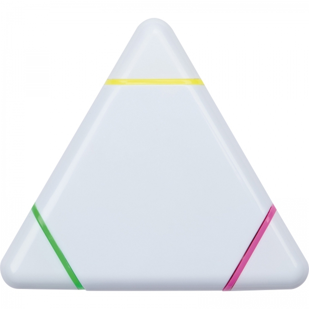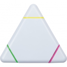 A three-color highlighter with a unique triangular shape, made from recycled materials, combines eco-friendliness with functionality. It features three tips in yellow, pink, and green, making it the perfect tool for highlighting important notes.