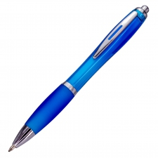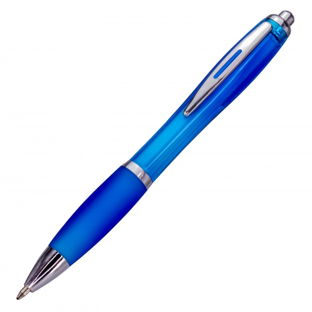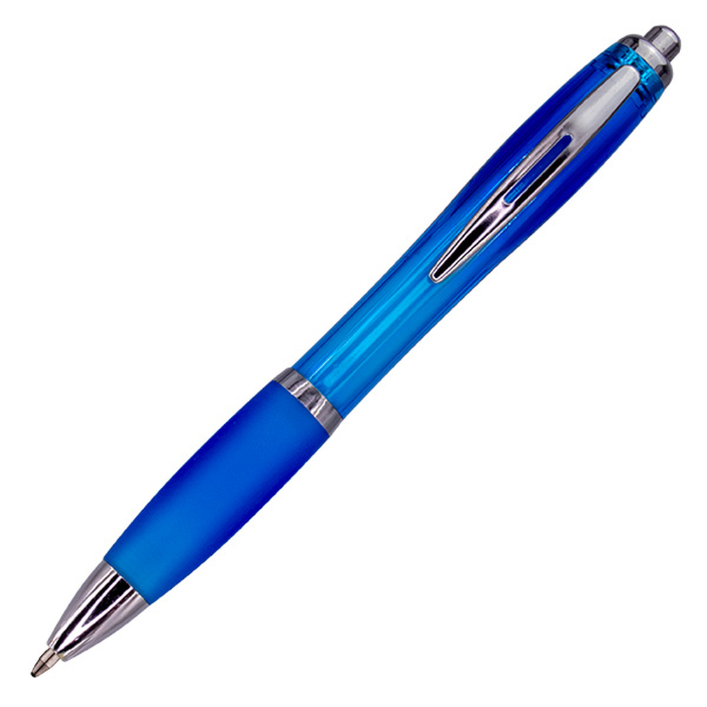 Transparent ball pen with silver metal clip, rubber grip zone and blue-writing large refill.