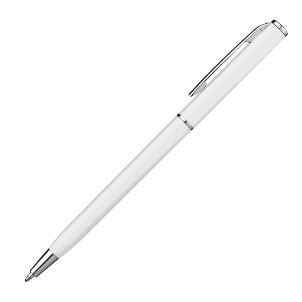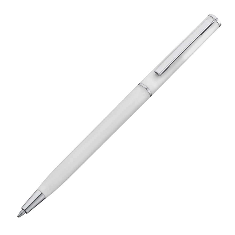 Twist mechanism ball pen made of plastic with blue-writing refill. This ball pen is due to its slim shape perfectly suited for loops of notebooks. We will print your advertising right from the clip.