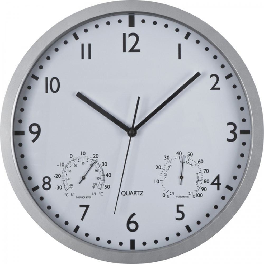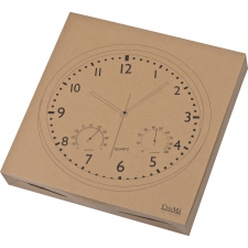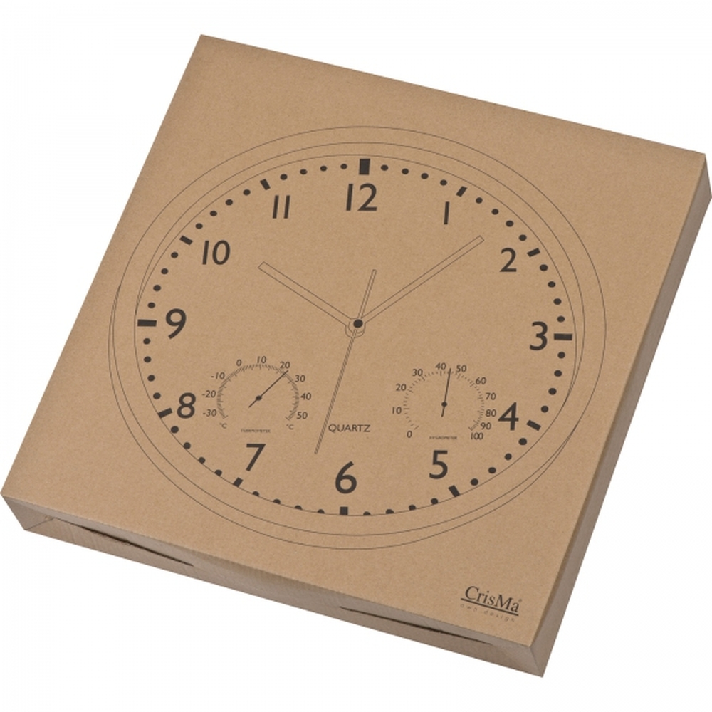 Classical wall clock with hygro and thermometer. By means of a bayonet catch the display can easily be taken out of the housing and the clock can easily be printed.
