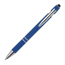 Metal balll pen with silver applications, blue writing refill, touch function and patterned grip zone.