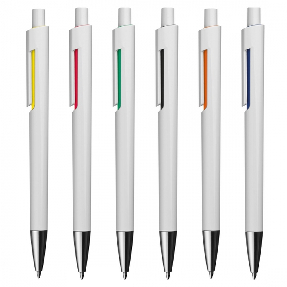Plastic pen with blue ink refill is a perfect blend of classic aesthetics and modern touches. Its white casing gives it an elegant, versatile look that fits any setting – office, school, or home desk. Additionally, the colorful detail under the clip subtly highlights its contemporary design.