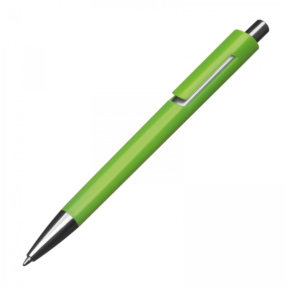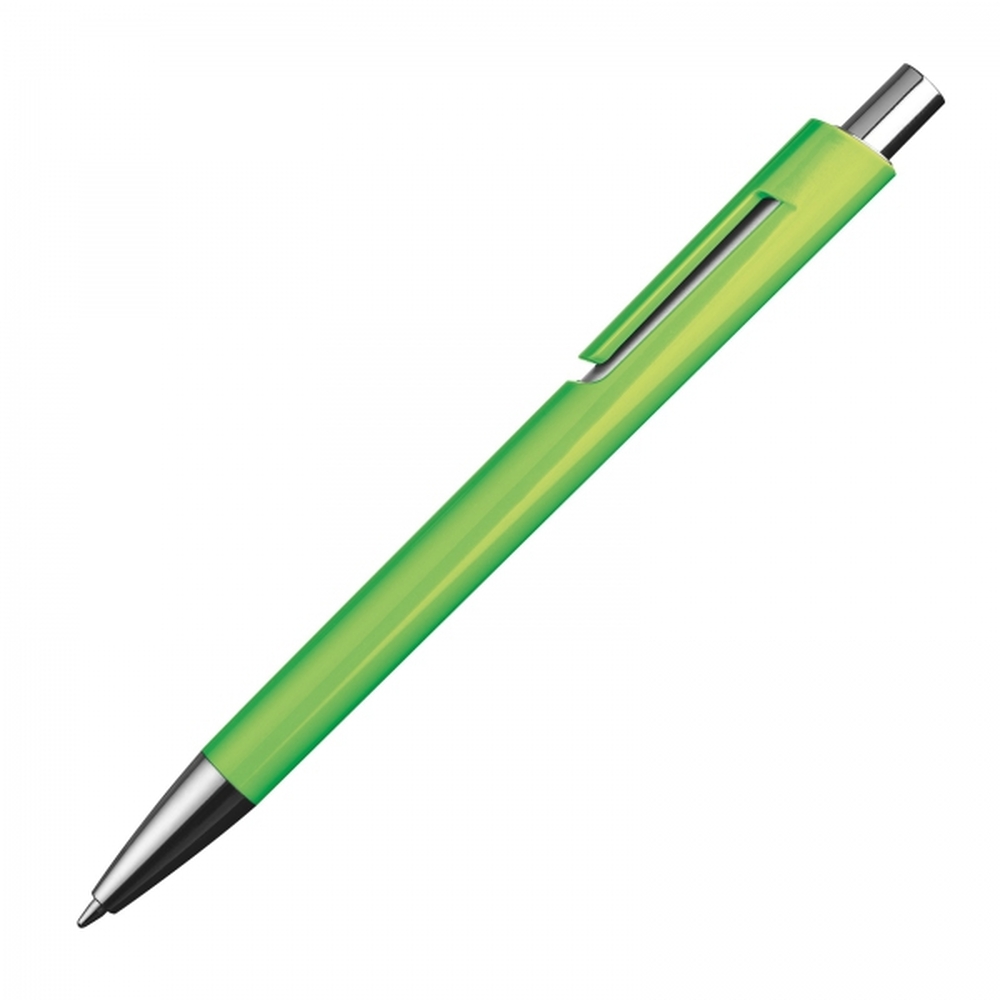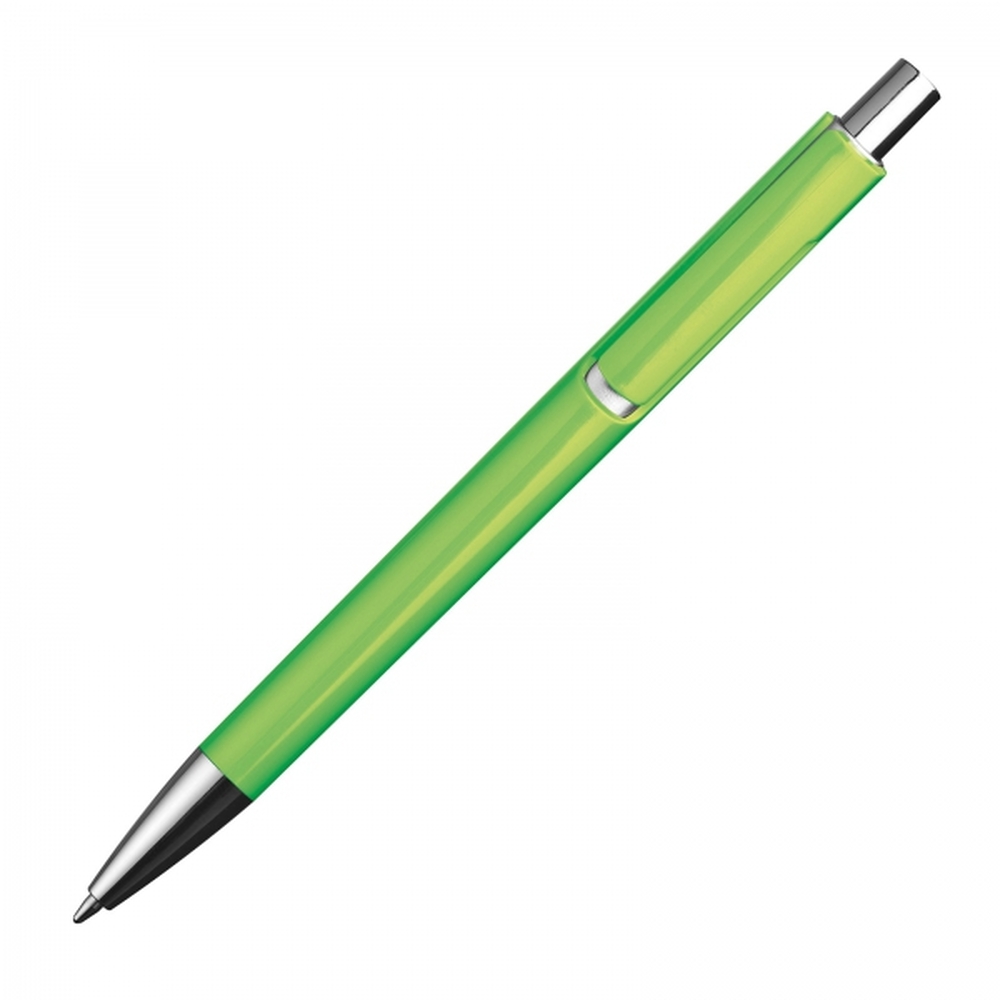 Plastic pen with blue ink combines classic design with modern details. Its slim construction ensures comfortable use, while the silver accent beneath the clip adds an elegant touch.